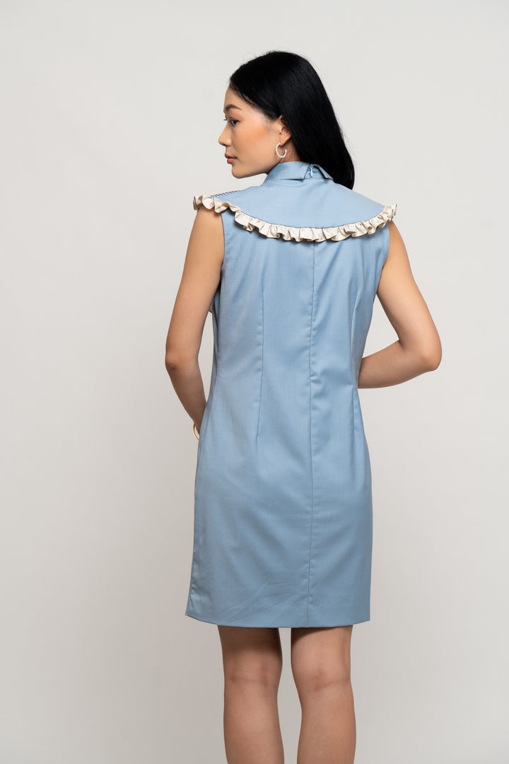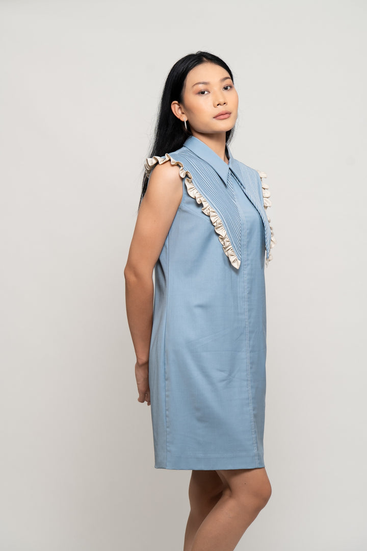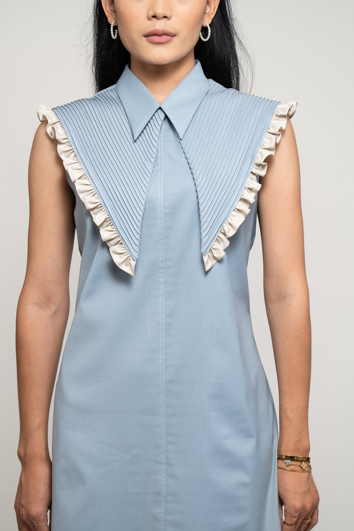Tailored to perfection in fine suiting, this ice-blue short summer dress is your desk-to-dine essential. Featuring a sharp collar with handcrafted pintucks and precise topstitch detailing, it balances structure with ease. The detachable collar transforms the look effortlessly—from boardroom to evening out. A cinched waist and clean back zip closure complete this polished silhouette.