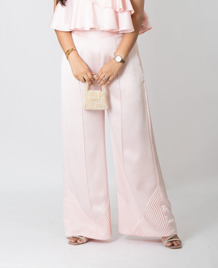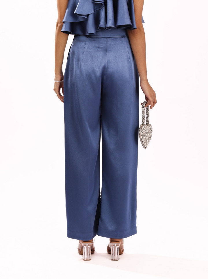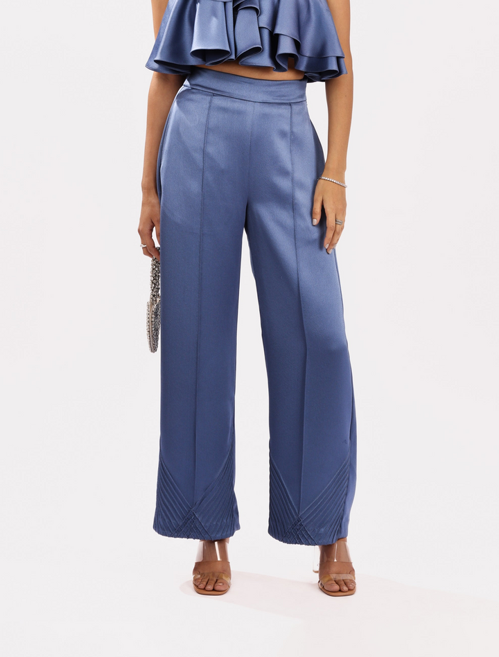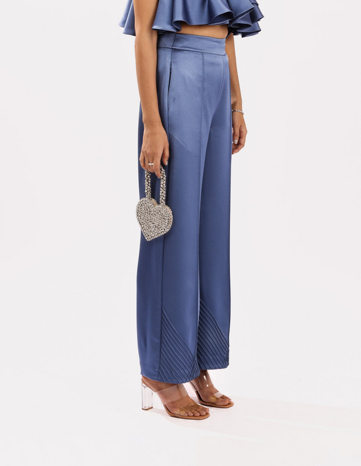 The high-waisted trousers offer a sleek silhouette, enhanced by a fine pin-tuck detail at the hem. A side zip closure maintains clean lines, while functional pockets add practicality. Darts ensure a perfect fit, making this set a statement of confidence and sophistication.