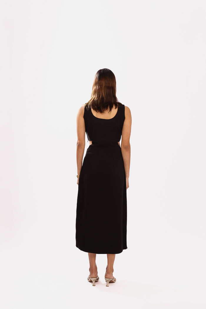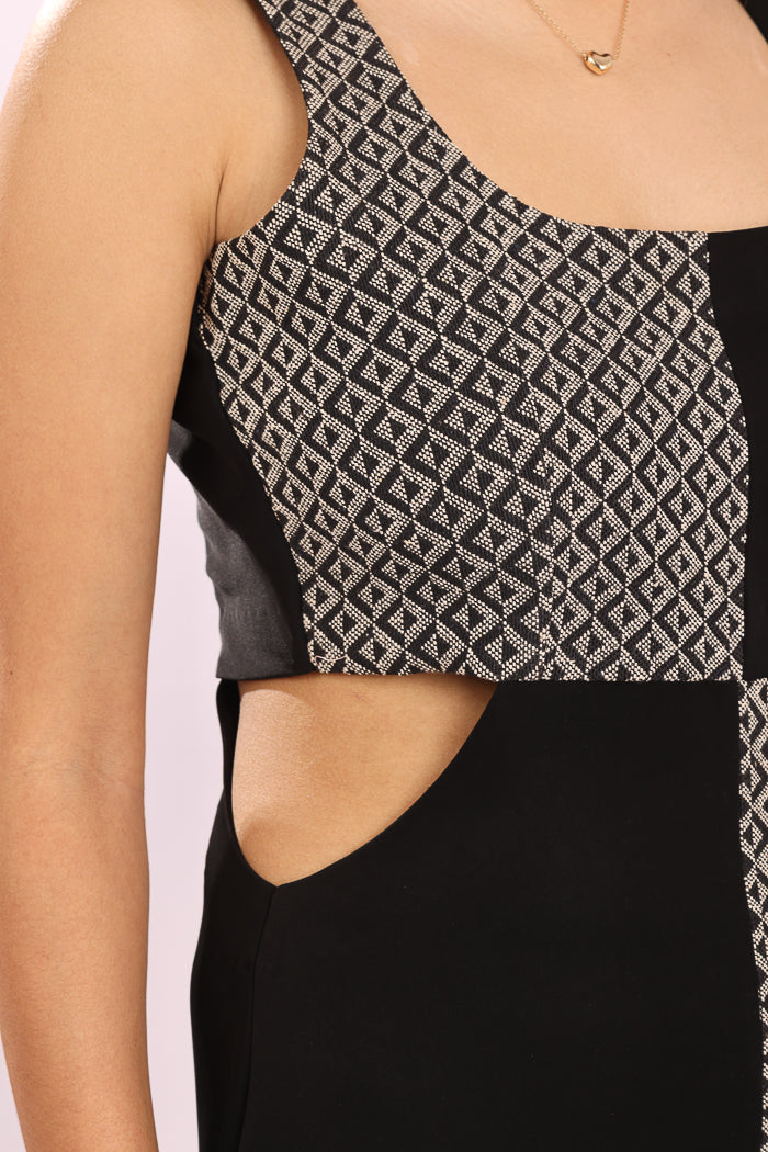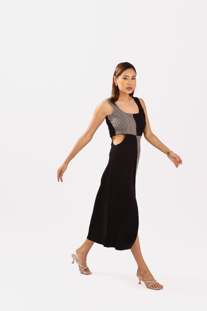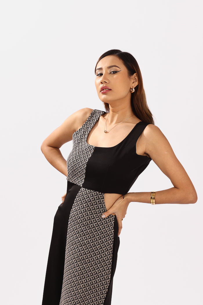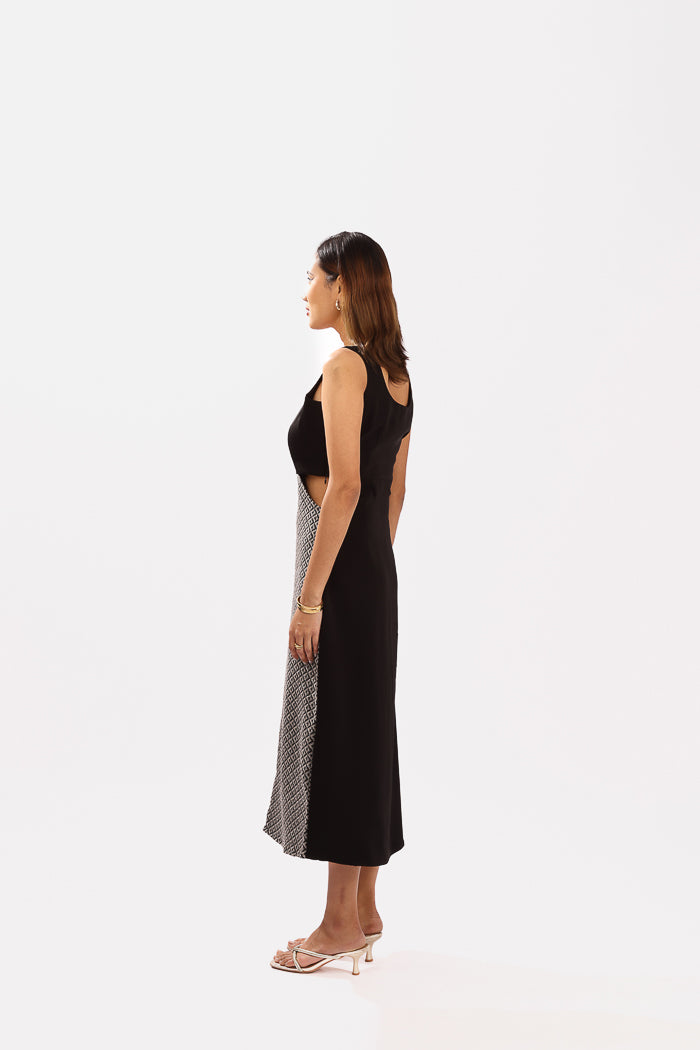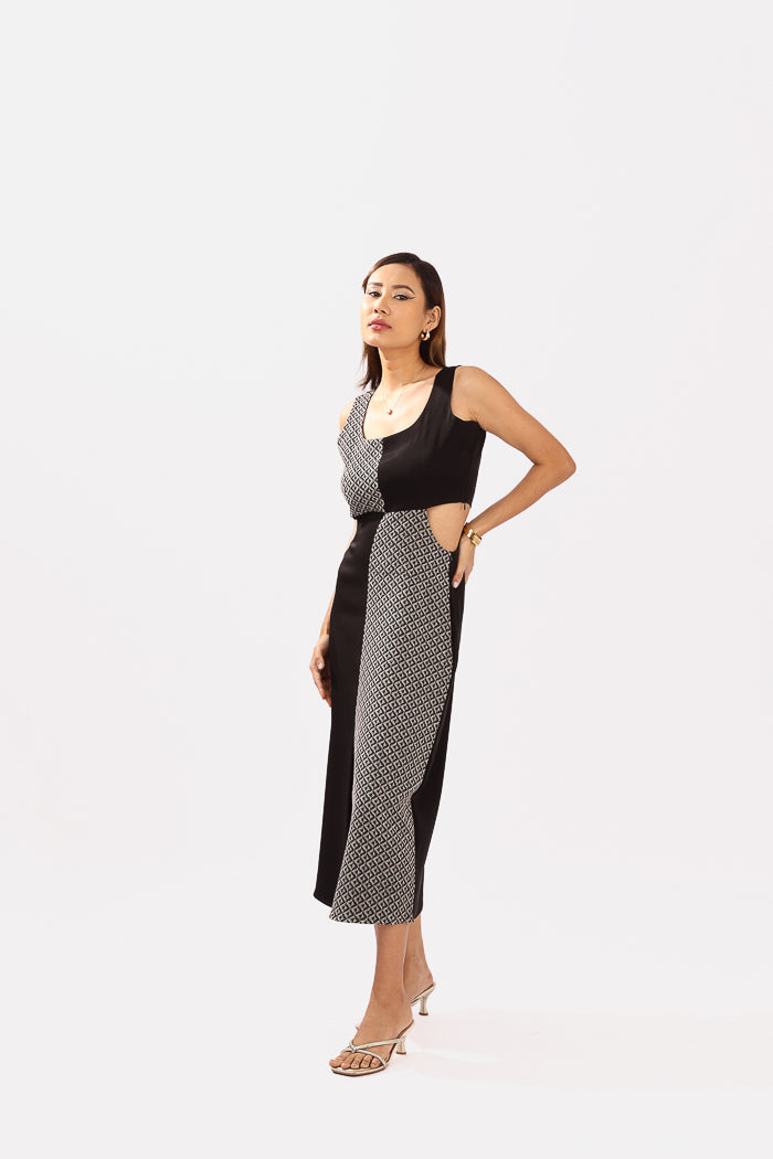 A perfect balance of structure and fluidity, this midi dress is crafted from a luxurious blend of Japanese suiting fabric and jacquard. The bold half-and-half paneling brings visual intrigue, while the sculpted bodice and square neckline offer a clean, modern silhouette.Side cut-outs add a touch of edge, creating a flattering shape that accentuates the waist, while a concealed side zip ensures a seamless fit. The jacquard detailing adds richness in texture, making this look ideal for elevated daytime events, gallery nights, or a sophisticated dinner date.
