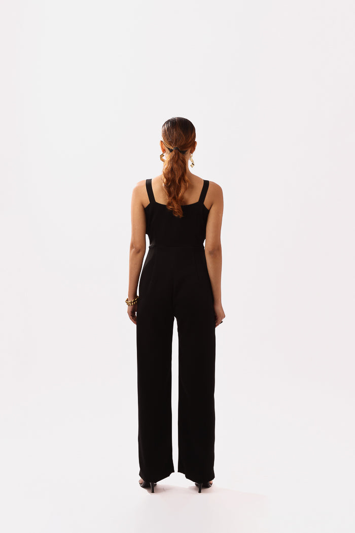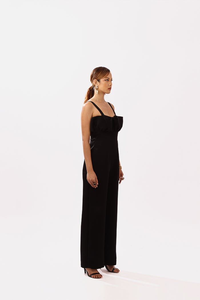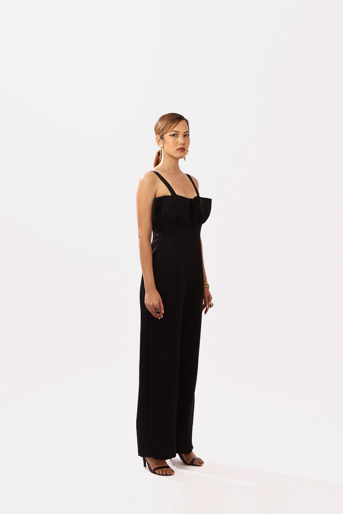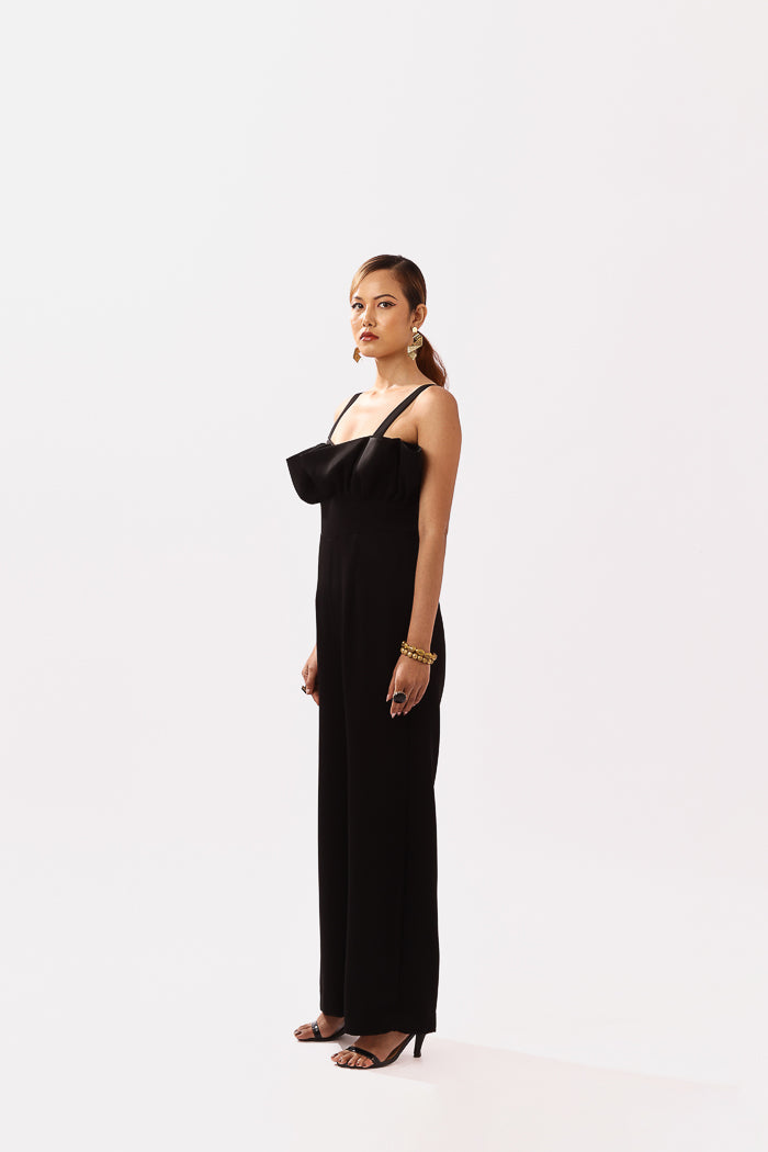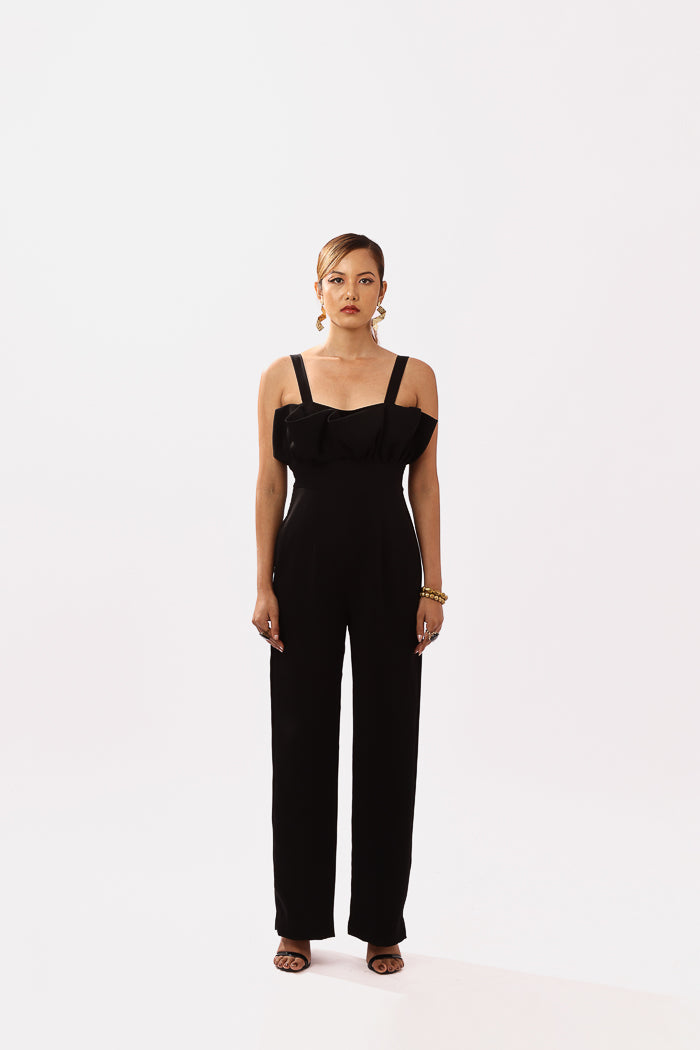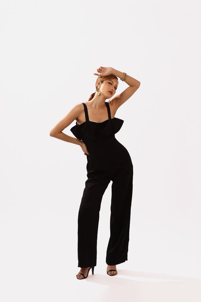 A true power-dressing statement, this jet black Japanese suiting jumpsuit blends structure, shape, and fluidity with effortless elegance. The flowy ruffle details on the upper torso create movement and drama, exuding confidence and sophistication. A cinched waist and back darts sculpt a flattering silhouette, while the wide-leg trousers add poise, comfort, and authority. Designed for modern elegance, the side zip closure ensures a seamless fit, and functional pockets add practicality. Perfect for those who want to command attention with grace and power.