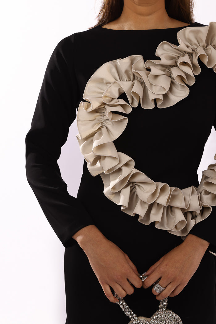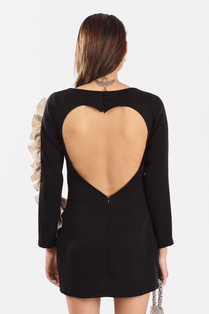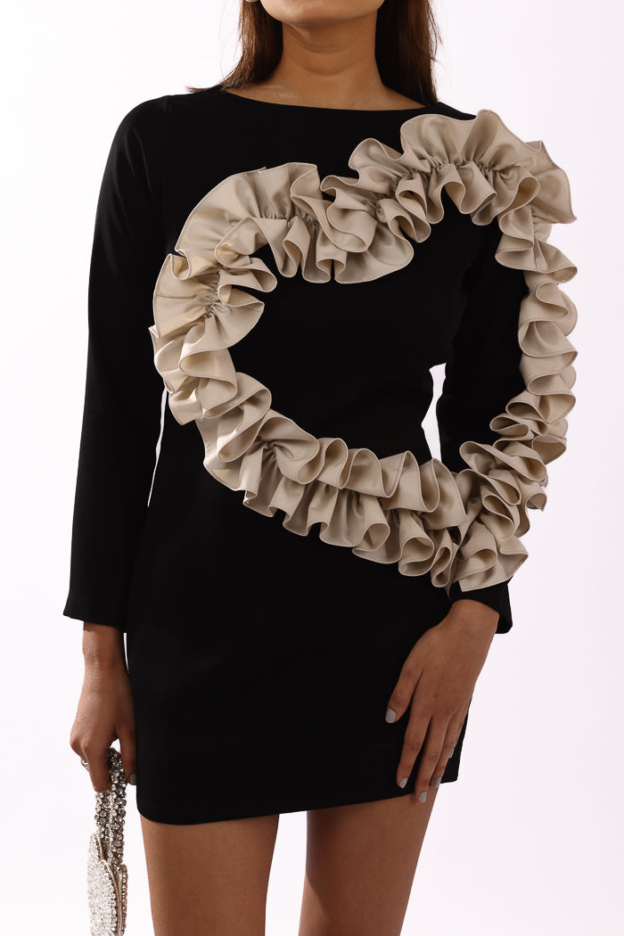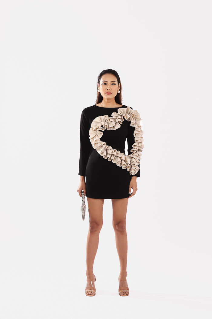 Crafted from Japanese suiting fabric, this little black dress blends luxury and comfort with its soft, stretchy material. A wide neck opening ensures easy wear, while the big heart detailing with ruffles adds a couture touch.