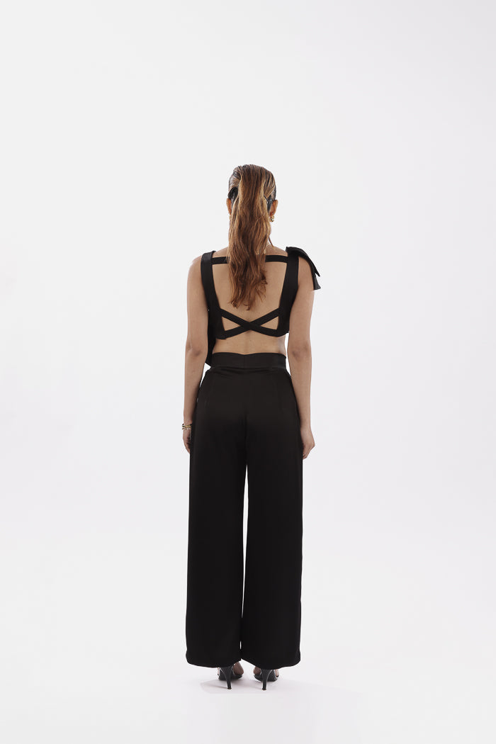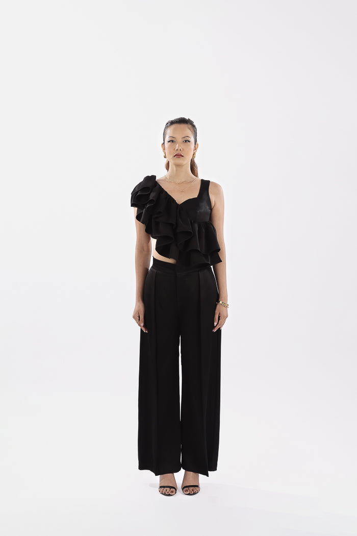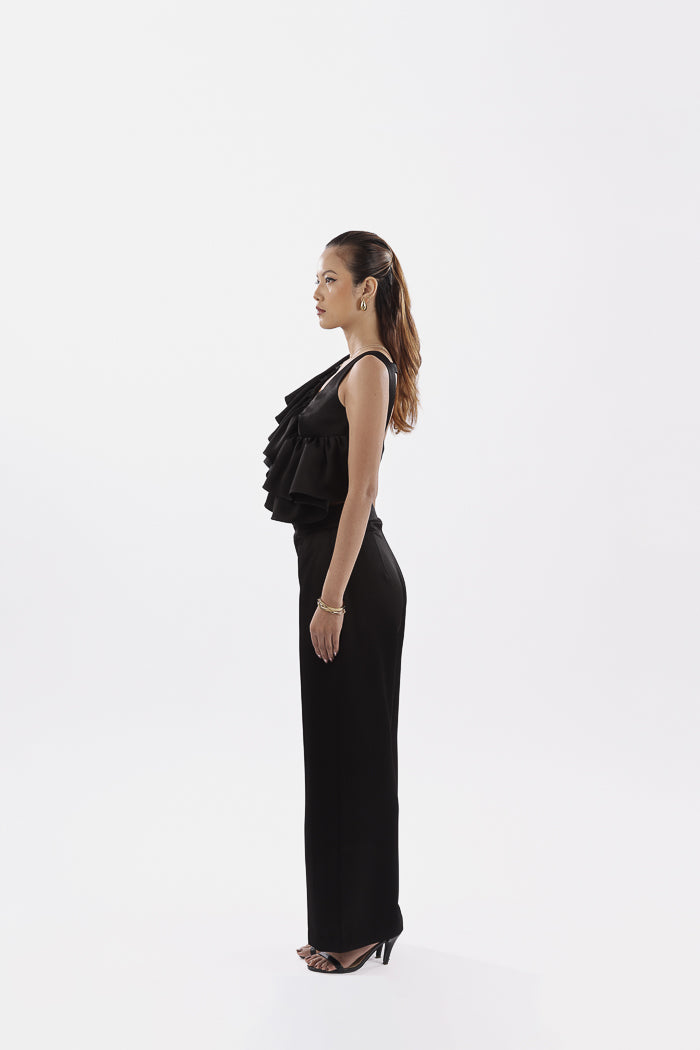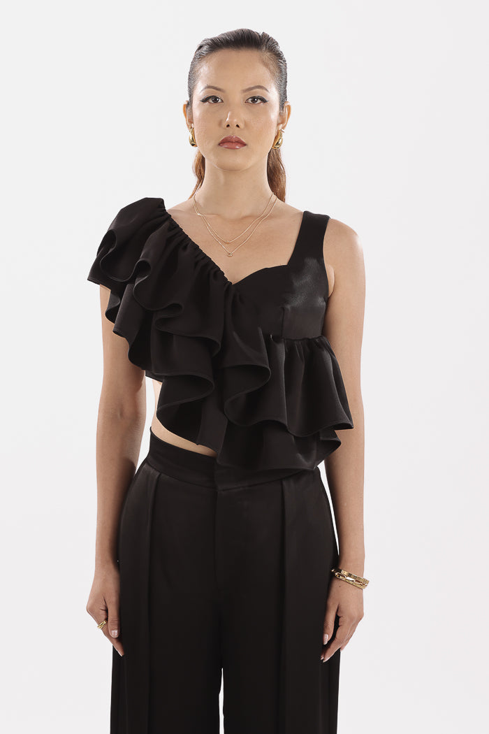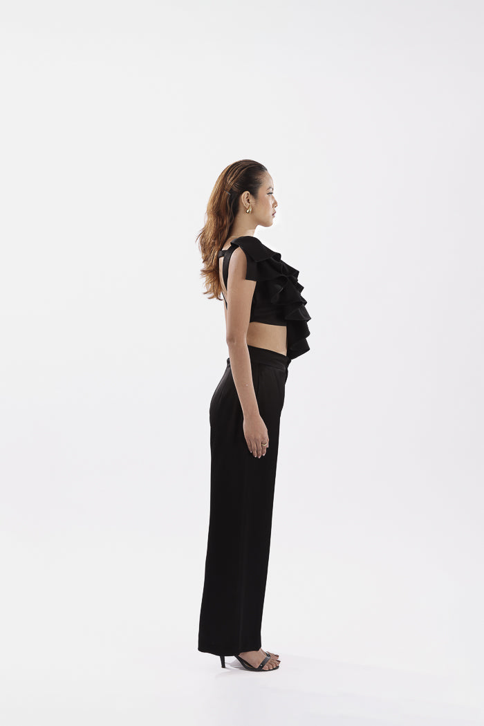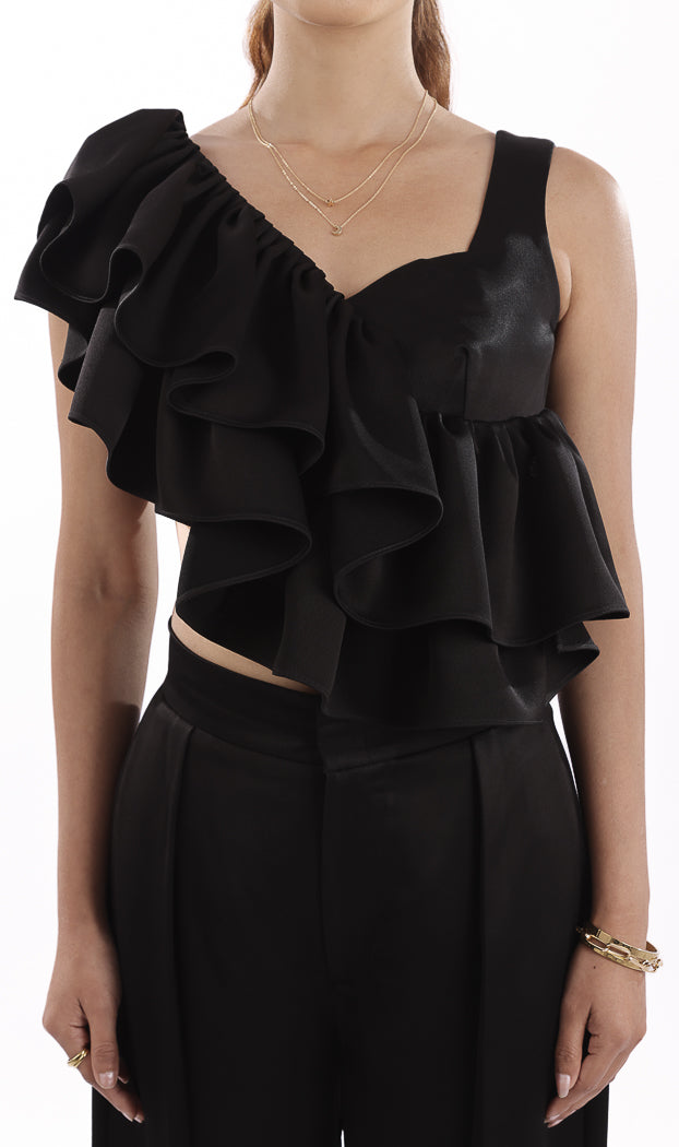 This one-shoulder top, crafted from luxurious shiny Italian suiting fabric, features double ruffle detailing for a dramatic, voluminous effect. A cross cut-out on the back adds a modern edge, while a side zip closure keeps the look clean. A strategic back strap ensures comfort and stability.