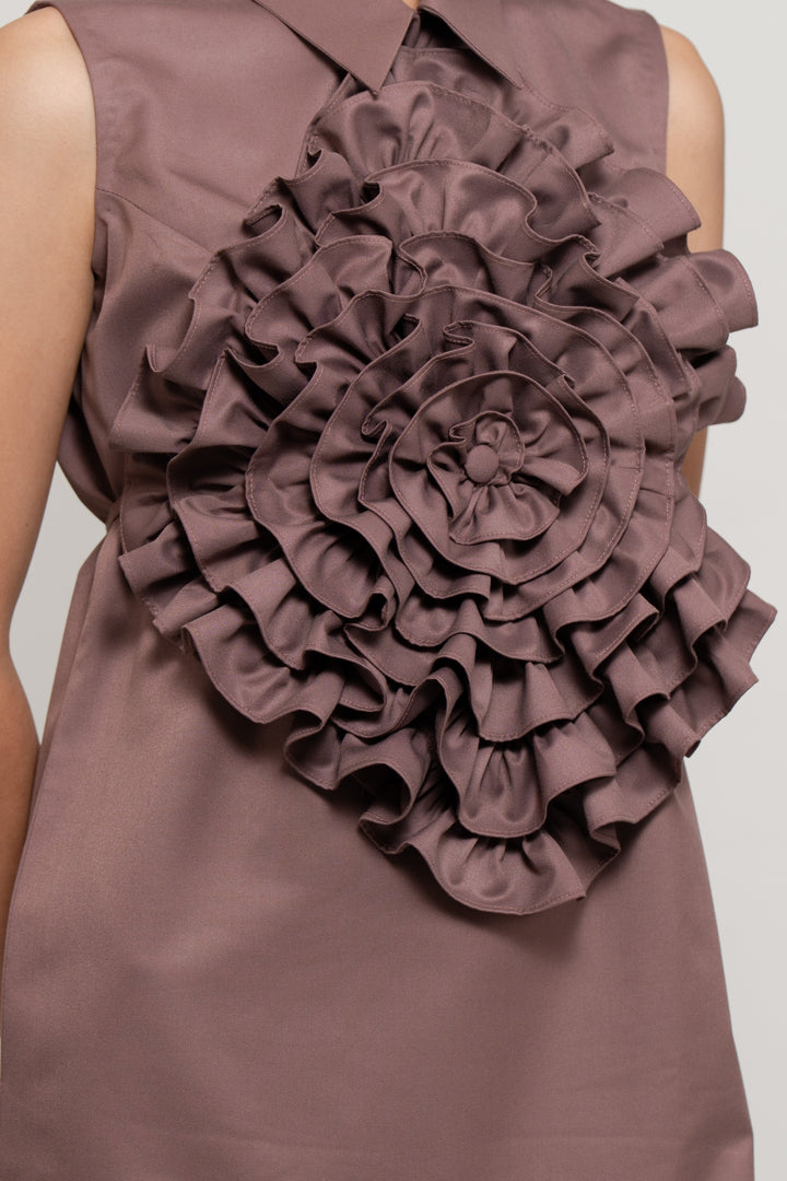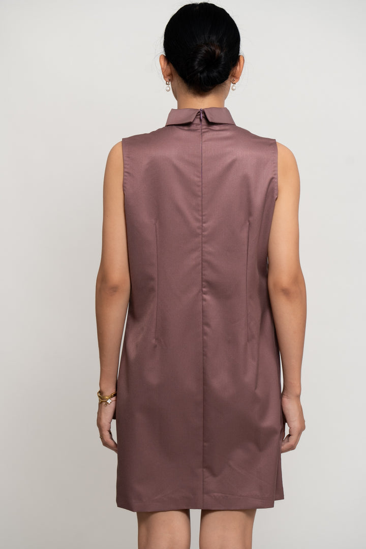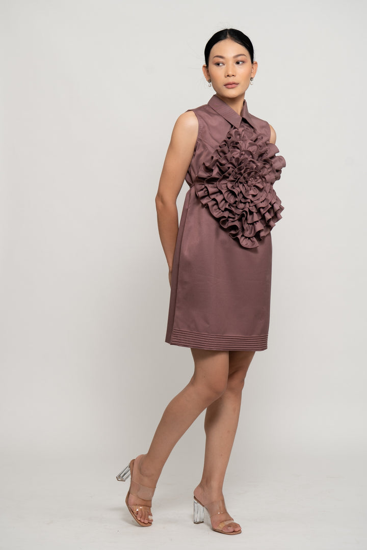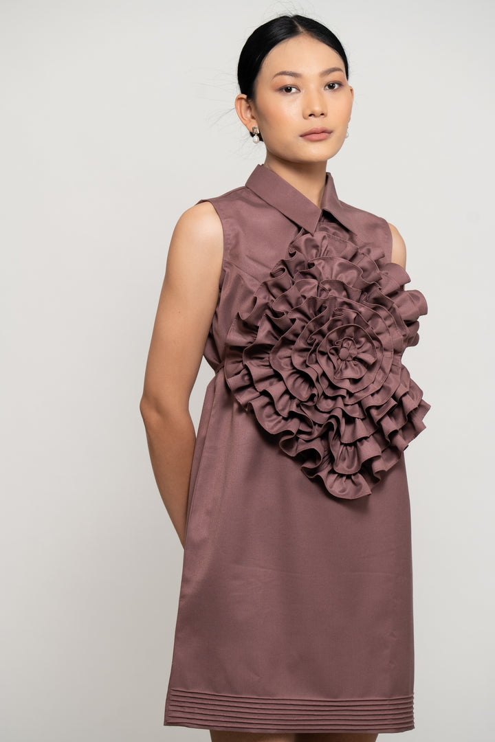 Crafted in fine suiting, this old rose short dress exudes timeless class and femininity. Featuring a sharp collar and back zip closure, it is detailed with delicate pintucks at the hem for subtle texture. The detachable ruffle flower collar belt adds a dramatic, couture-inspired flair—offering versatile styling options. Effortlessly elegant, this dress is a sophisticated staple for any refined wardrobe.