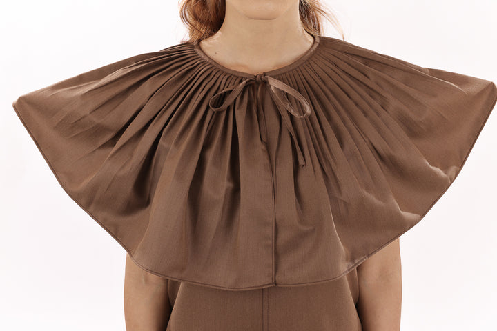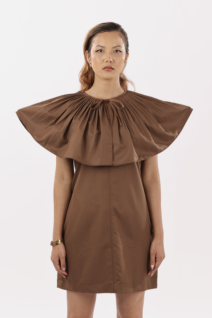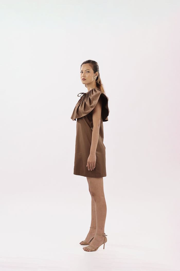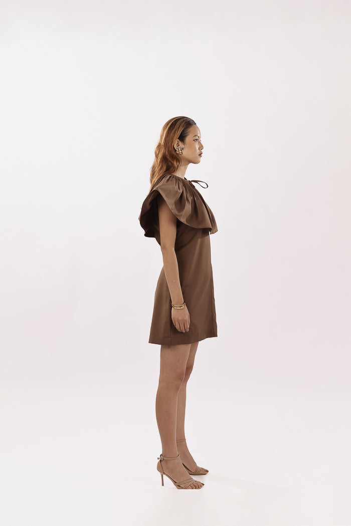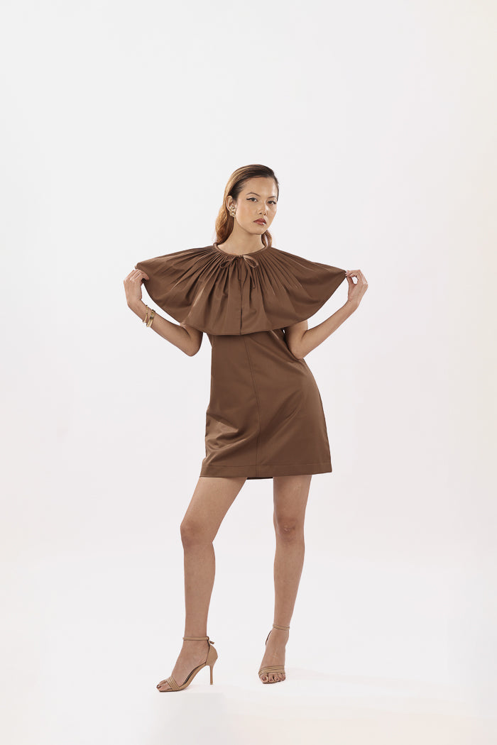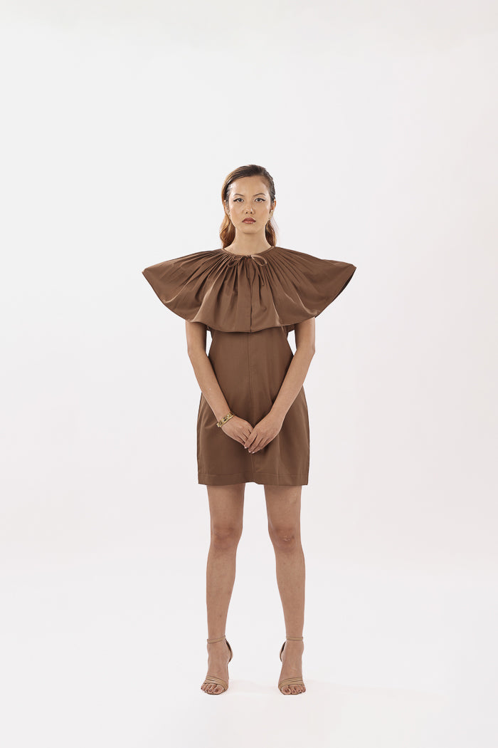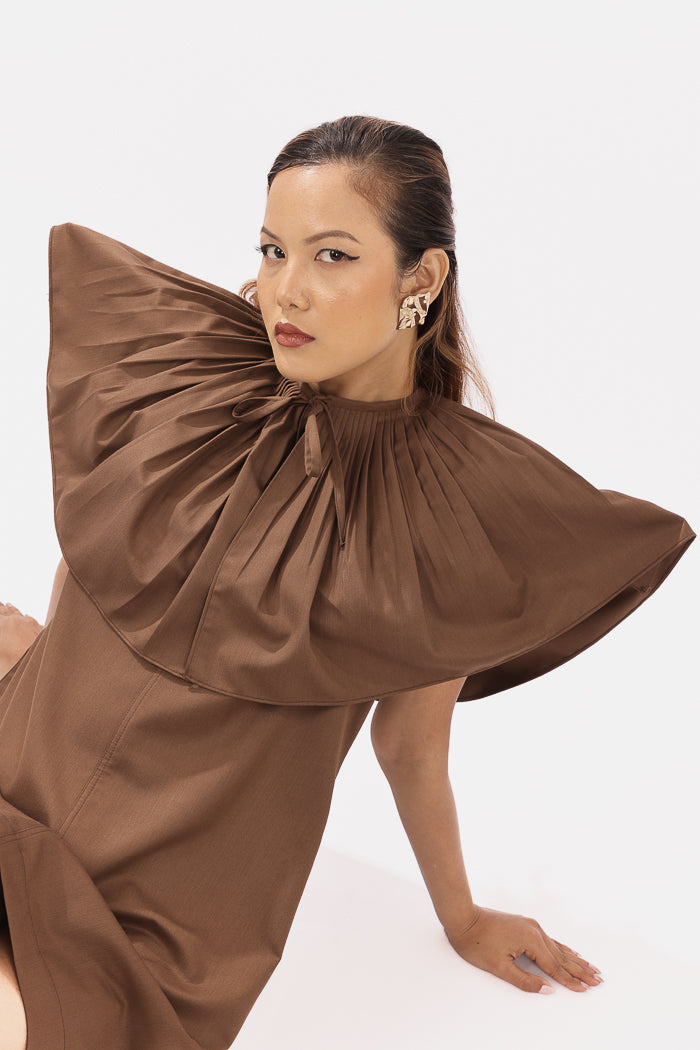 Crafted from cotton suiting, this brown dress exudes power and futuristic elegance. The exaggerated butterfly-like structure adds drama and luxury, while the style lines enhance the detailing. A small bow introduces a touch of cuteness, balancing the bold design. The keyhole opening in the front ensures ease of wear, making it perfect for dates, parties, or formal gatherings. Versatile and chic, it can be dressed up or down effortlessly.