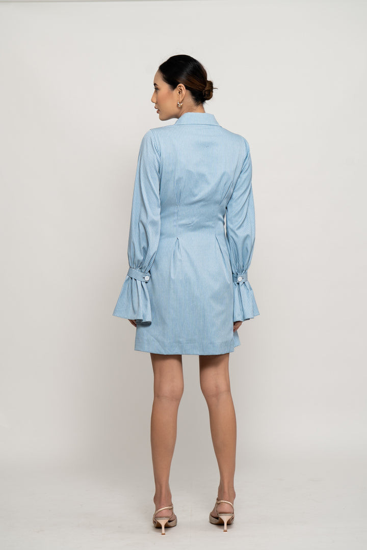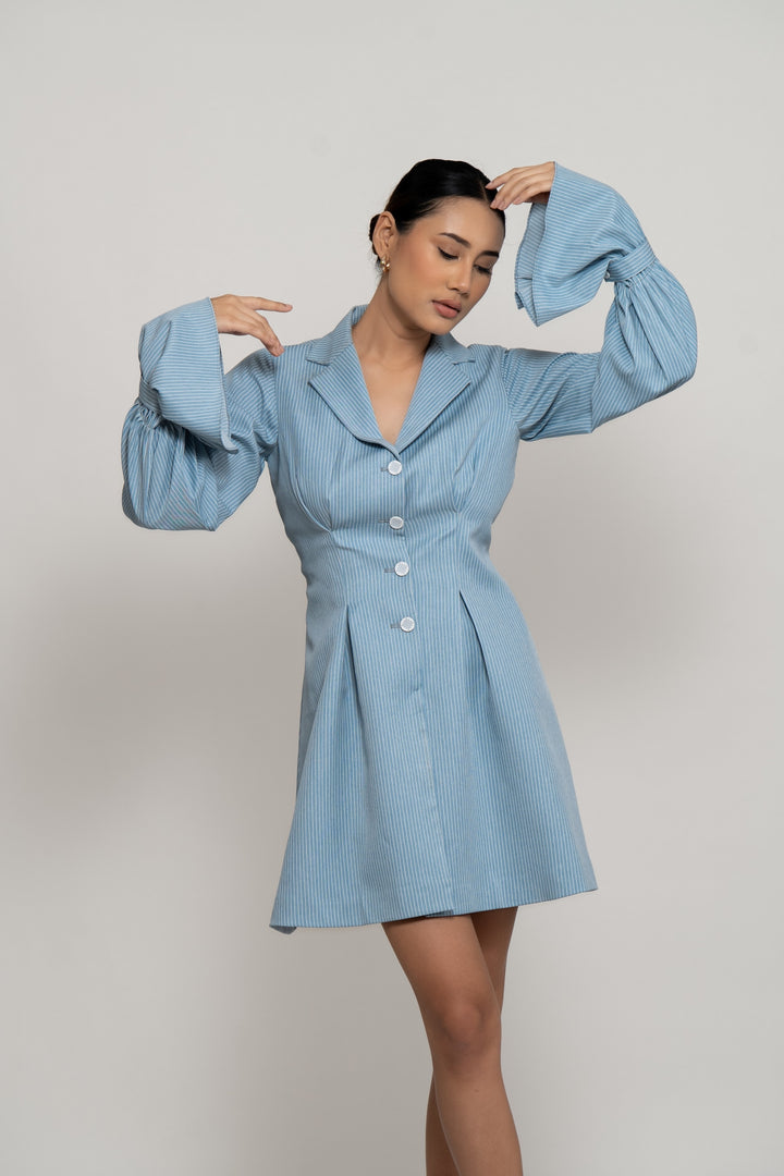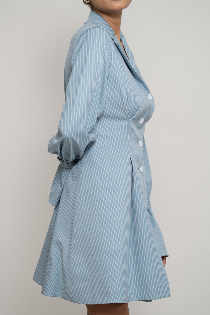 Made in breathable Giza cotton, this blazer dress strikes the perfect balance between girly charm and formal polish—ideal for events and gatherings. Designed with a sharp collar, front button closure, and a cinched waist, it flatters the silhouette effortlessly. Exaggerated sleeves and front pleat details add structure and a touch of boldness to this modern classic.