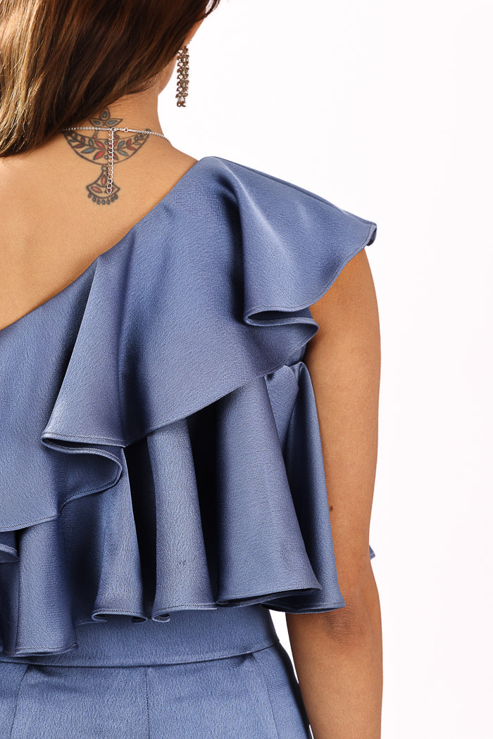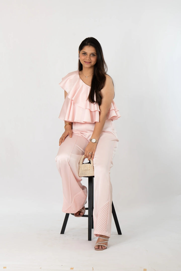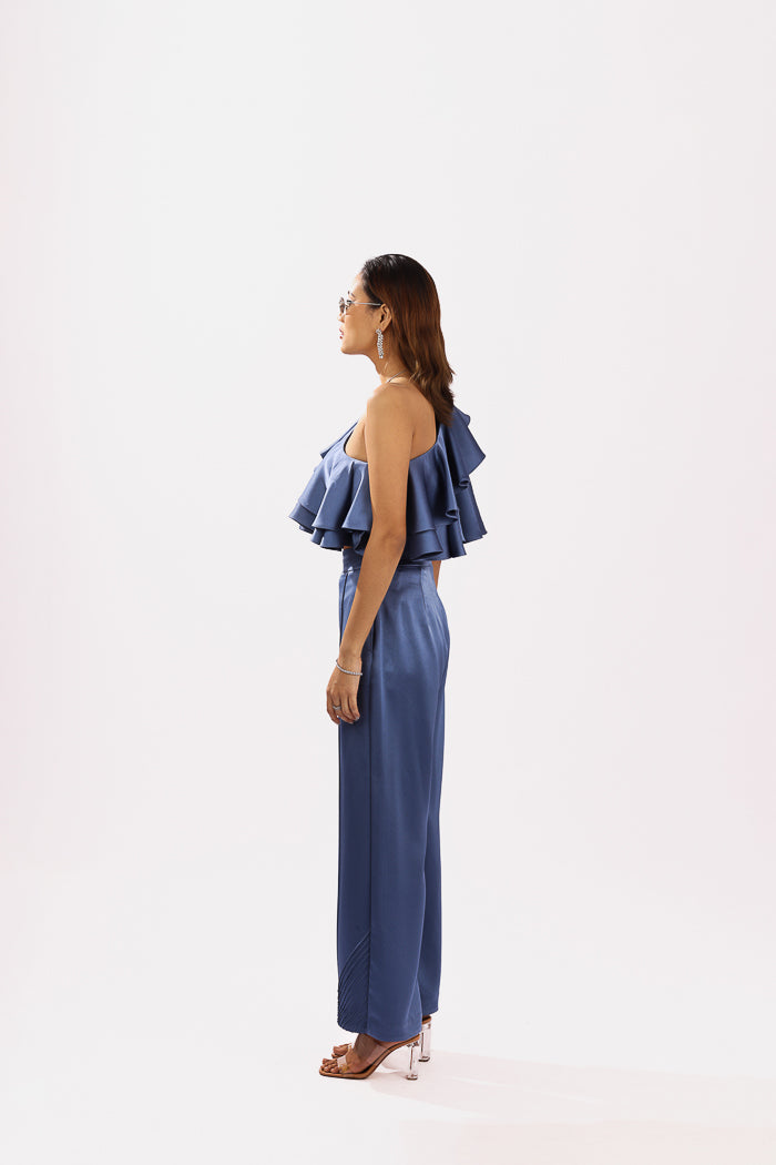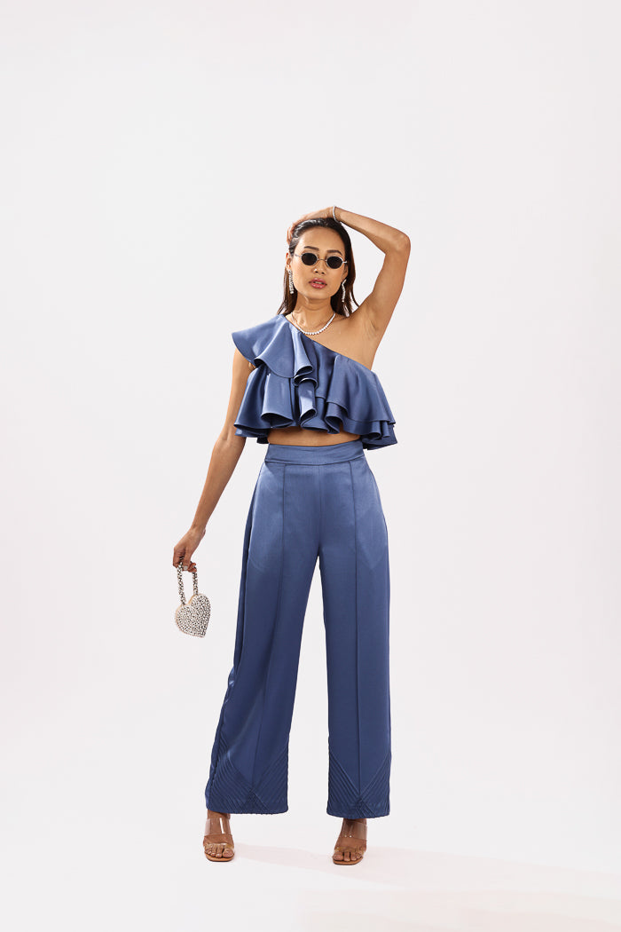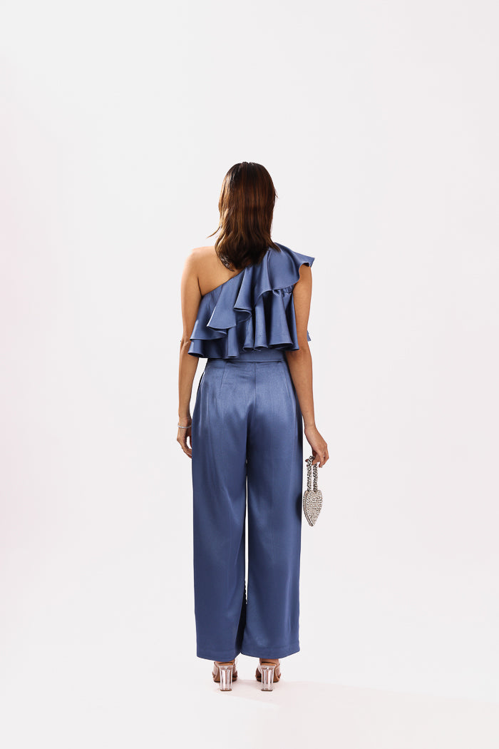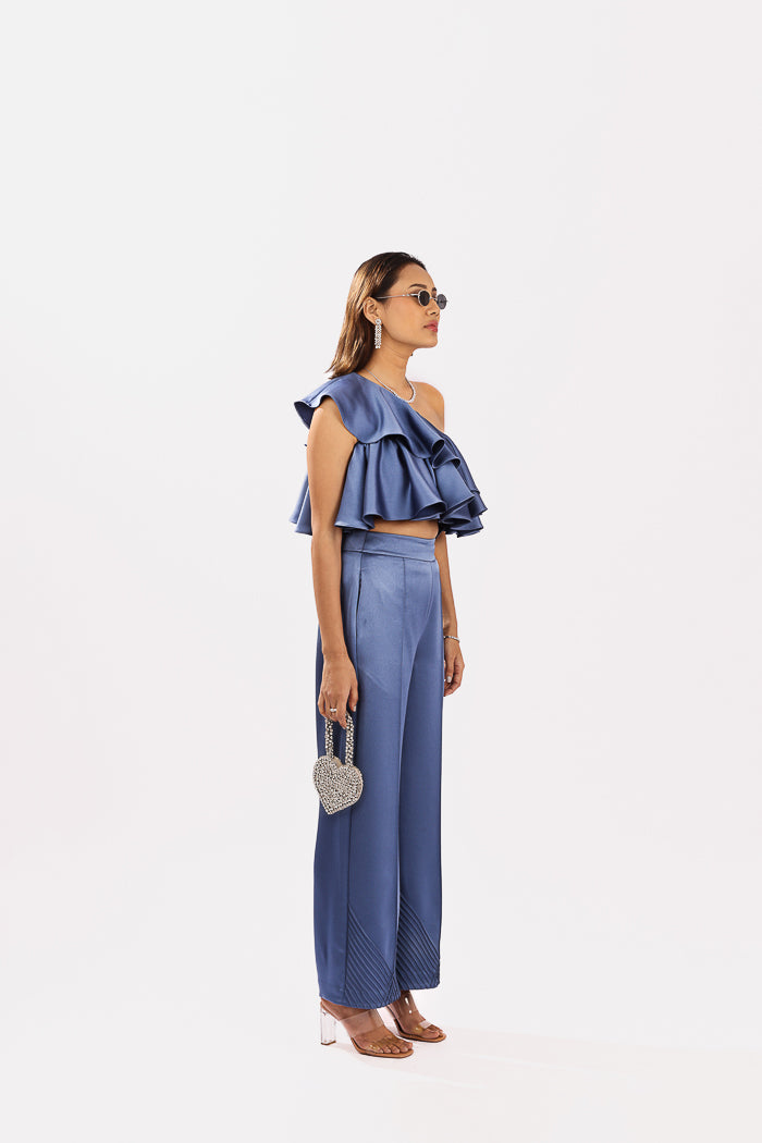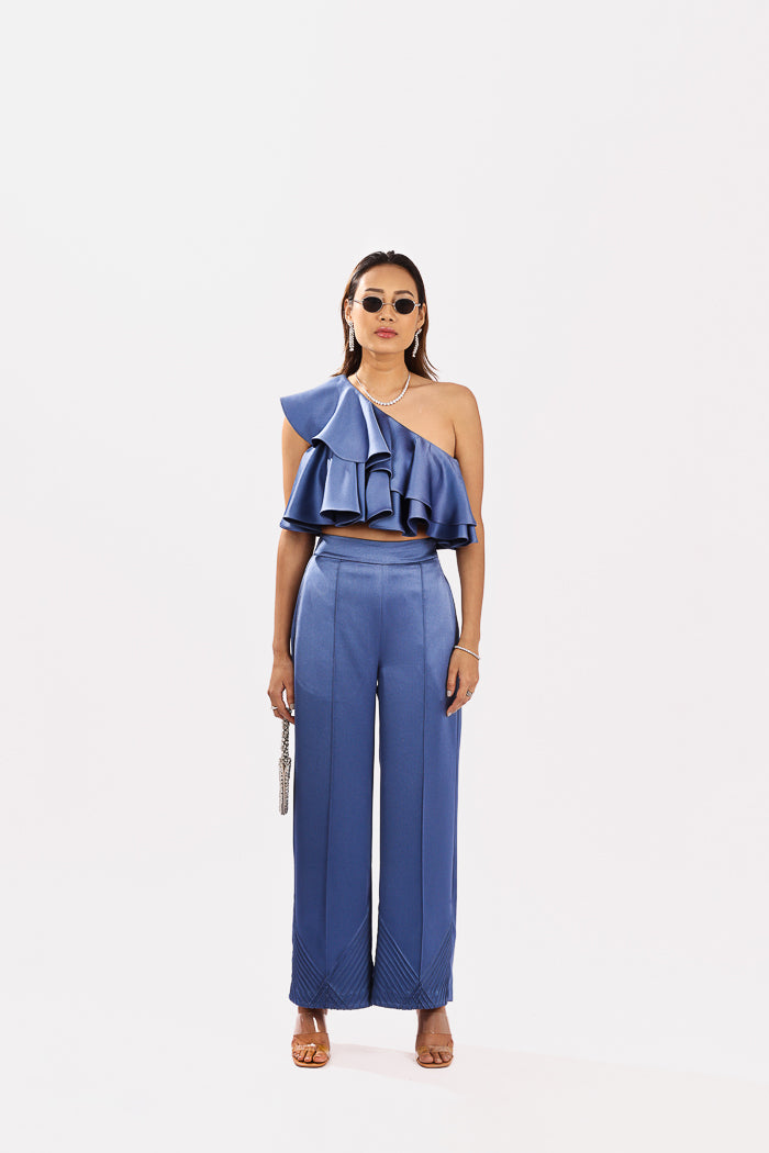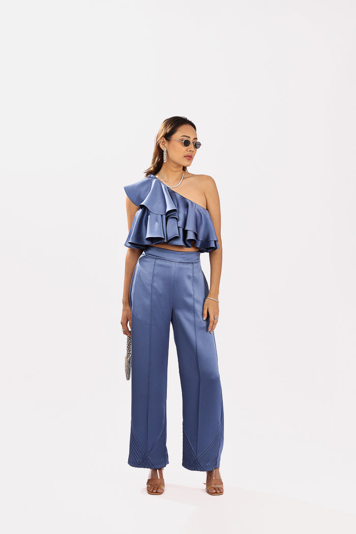 Crafted from shiny Italian fabric, this luxurious coord set is perfect for evening elegance. The one-shoulder top features fluid-like ruffles for a dramatic, sculptural effect, with a side zip closure ensuring a seamless look.