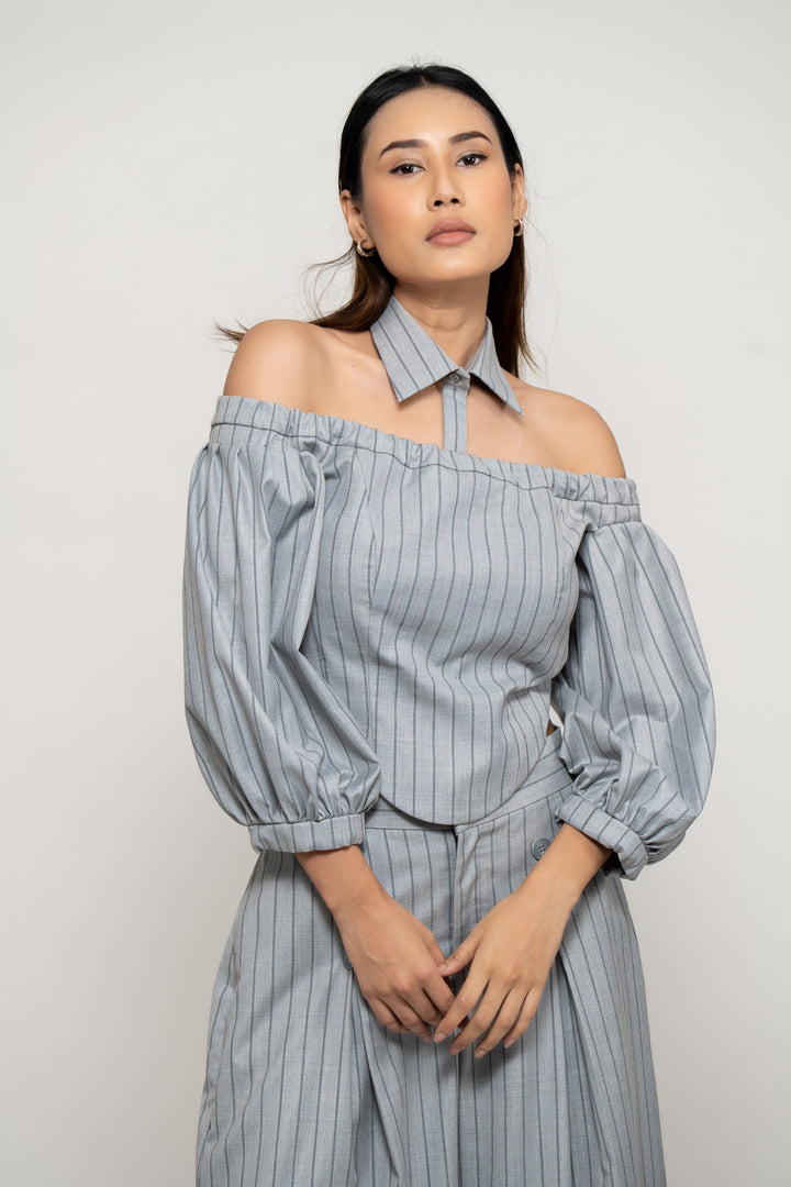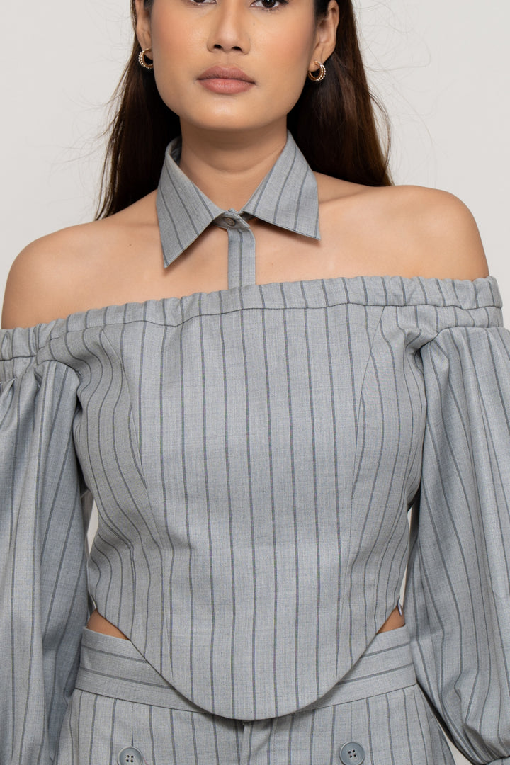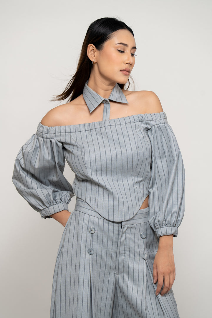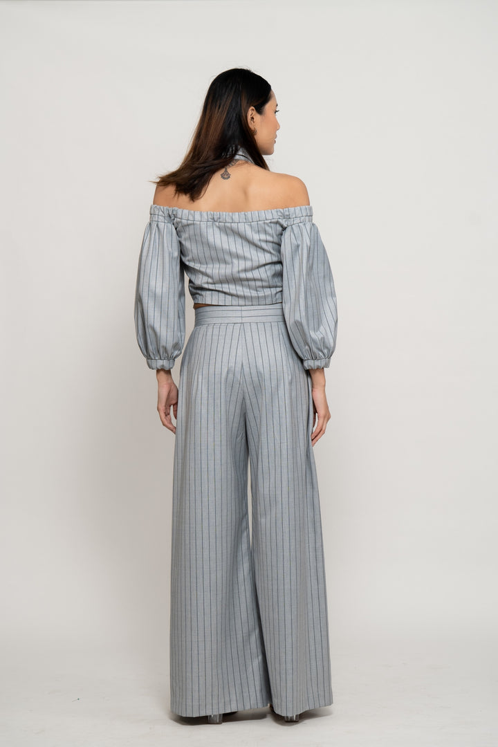 Made in Super 120’s wool blend, this co-ord set is designed for the modern boss lady. The corset-style top features an off-shoulder silhouette for a subtle peekaboo effect, with a side zip for a sleek fit. The detachable collar doubles as a chic accessory, adding versatility. The wide-leg trousers are tailored with side zip closure, functional pockets, a front button detail, and an inverted box pleat for added structure. Powerful, polished, and ready to own the room.