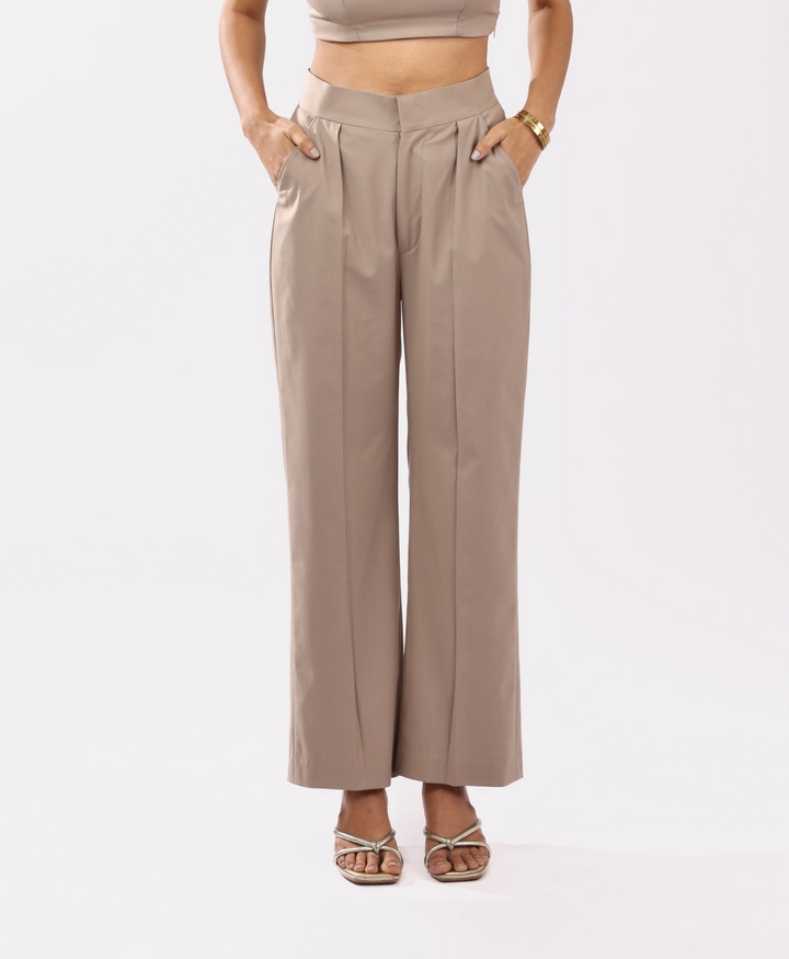 A modern ode to tonal dressing, this trouser embodies understated glamour with a sculptural twist.the high-waisted, wide-leg trousers with pleats at the waistband add tailored sophistication. Functional side pockets offer ease and practicality. this trouser blurs the lines between refined minimalism and bold feminine energy—perfect for rooftop soirées, gallery evenings, or elevated daywear.