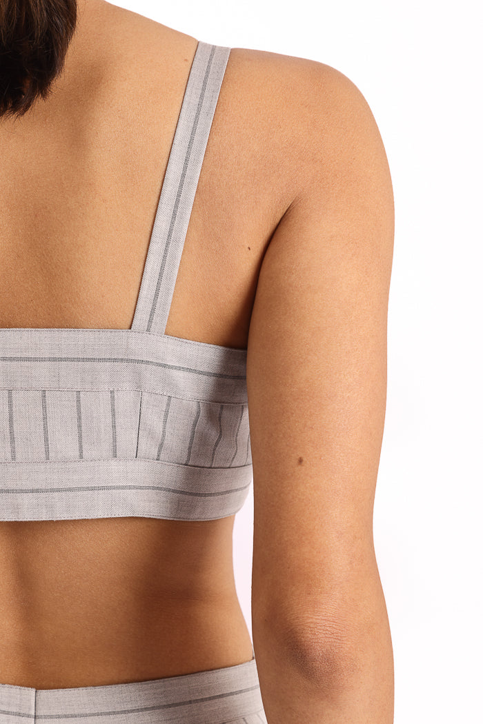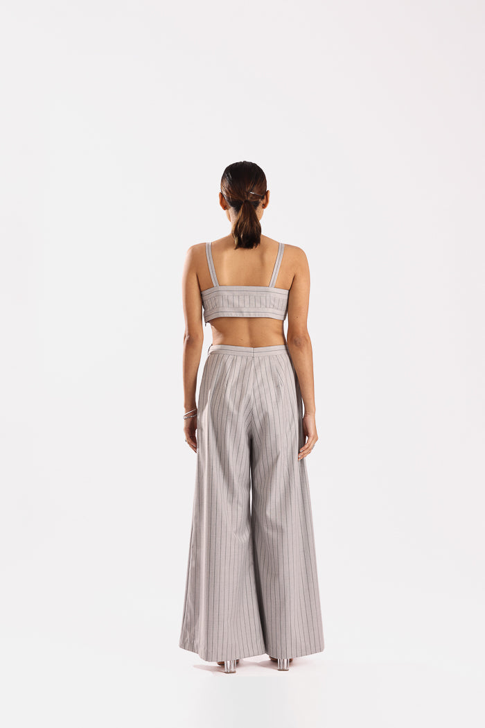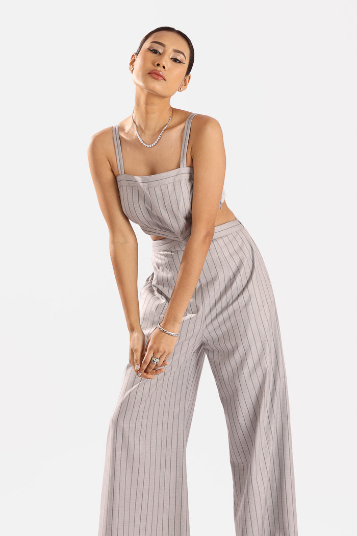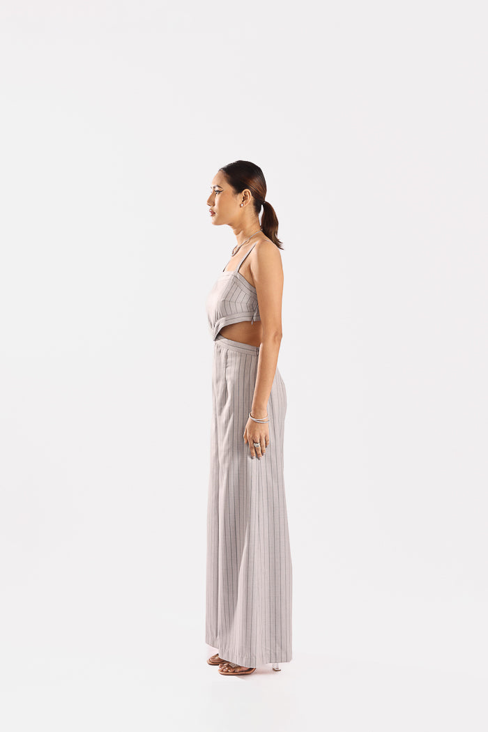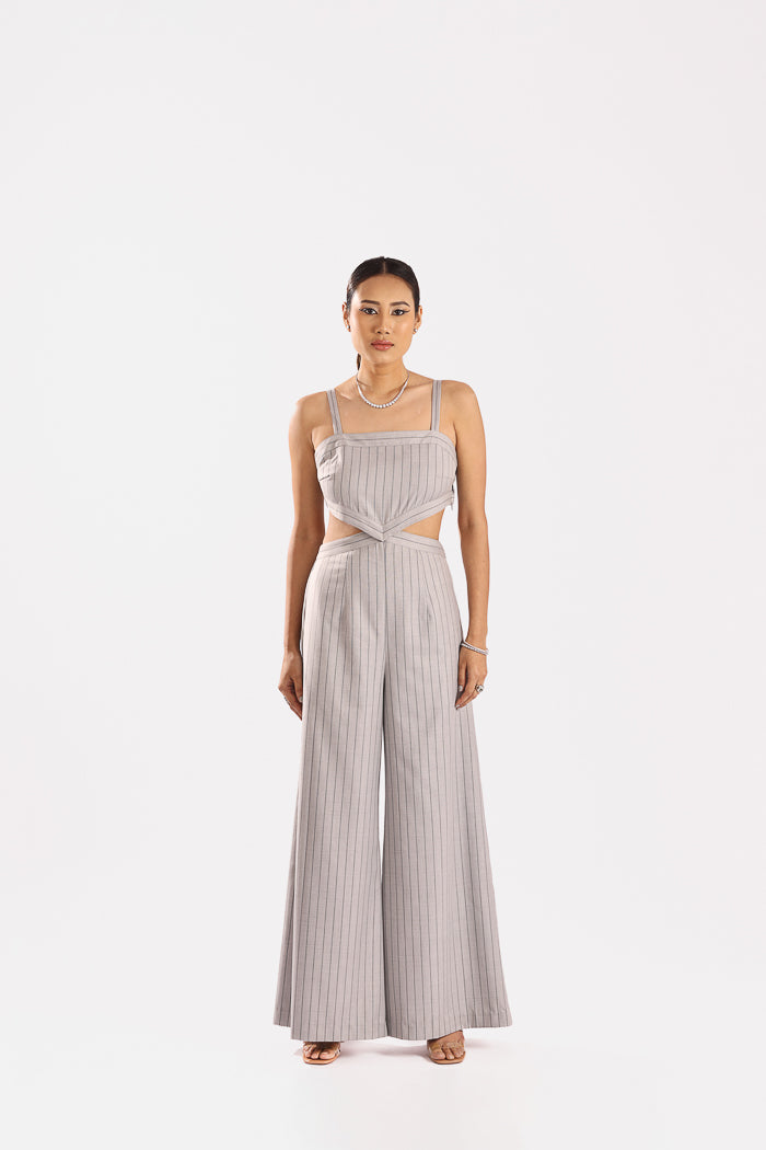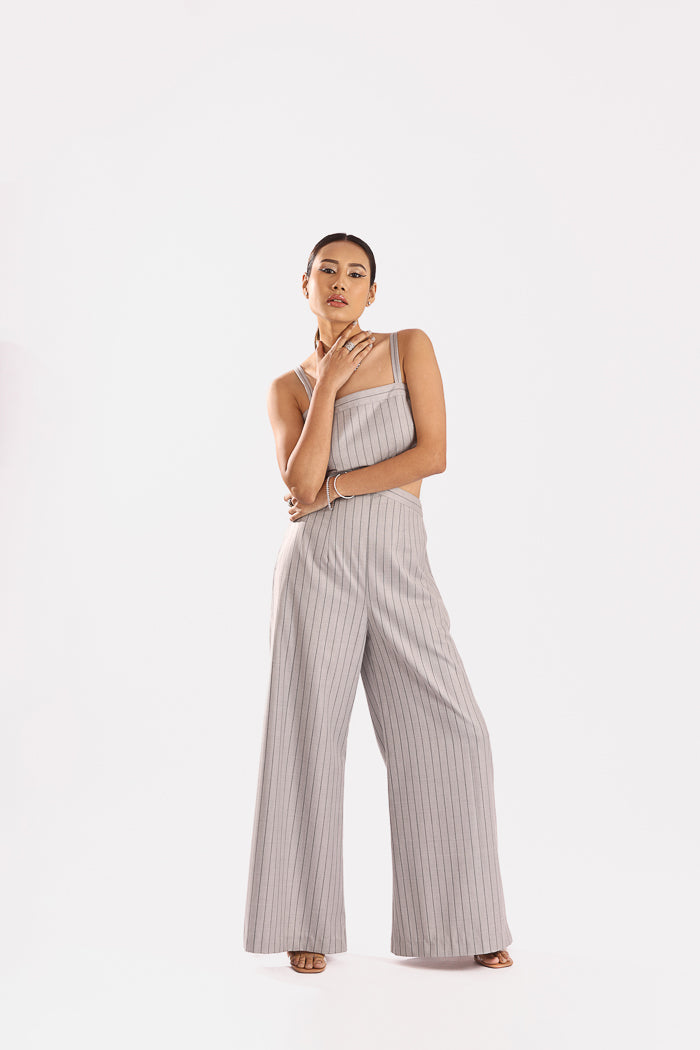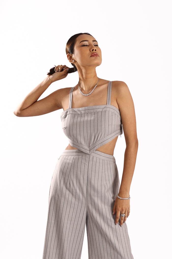 Designed for versatility, its two-part construction allows the top and pants to be worn separately, secured by a hook connection. Concealed side zippers create a seamless finish, and striped patterns enhance height, making this a timeless statement piece. This jumpsuit is a power move in itself—strong, stylish, and multi-functional."