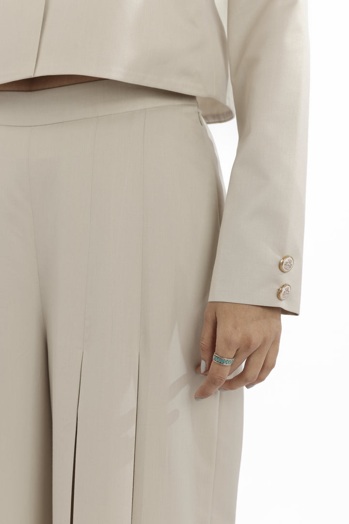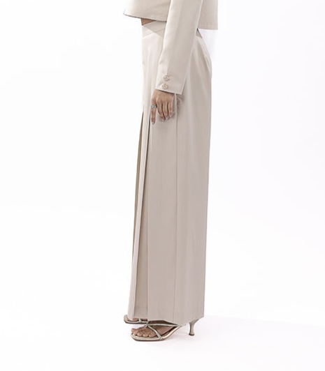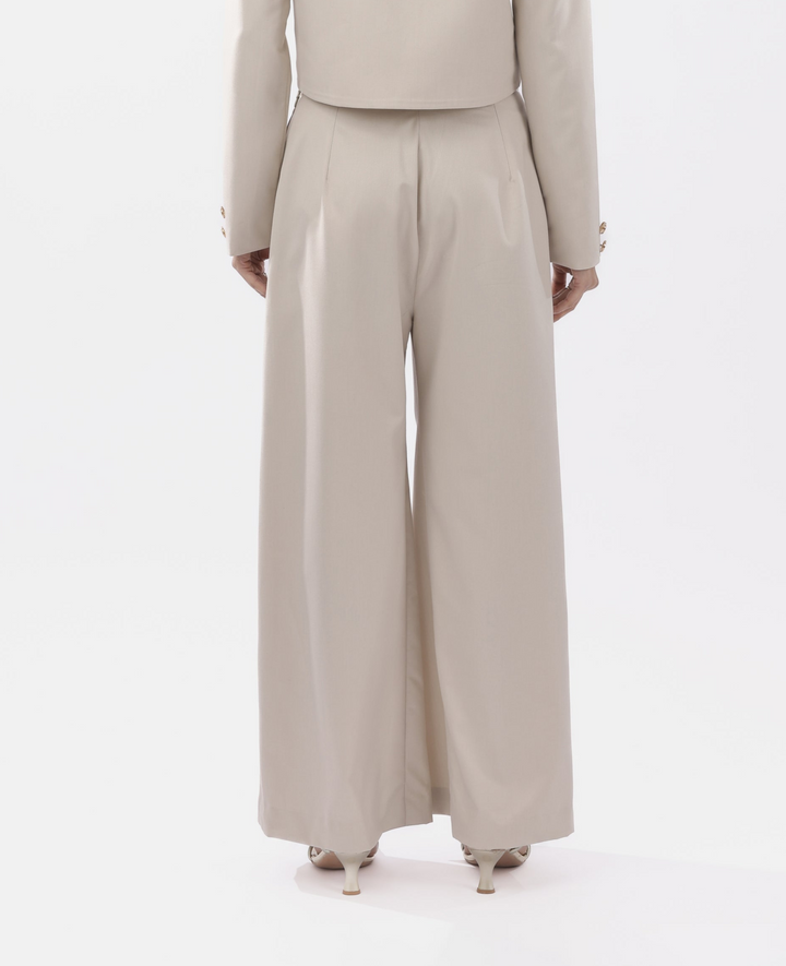 Tailored with quiet luxury in mind, this trouser is crafted from premium Italian suiting fabric, offering a smooth, structured finish with an impeccable fit.The high-waisted trousers steal the spotlight with crisp inverted double pleats that fall cleanly into a dramatic wide-leg silhouette. Functional pockets add everyday ease to this powerfully polished look, making it ideal for work-to-dinner transitions, modern formalwear, or effortless occasion dressing.