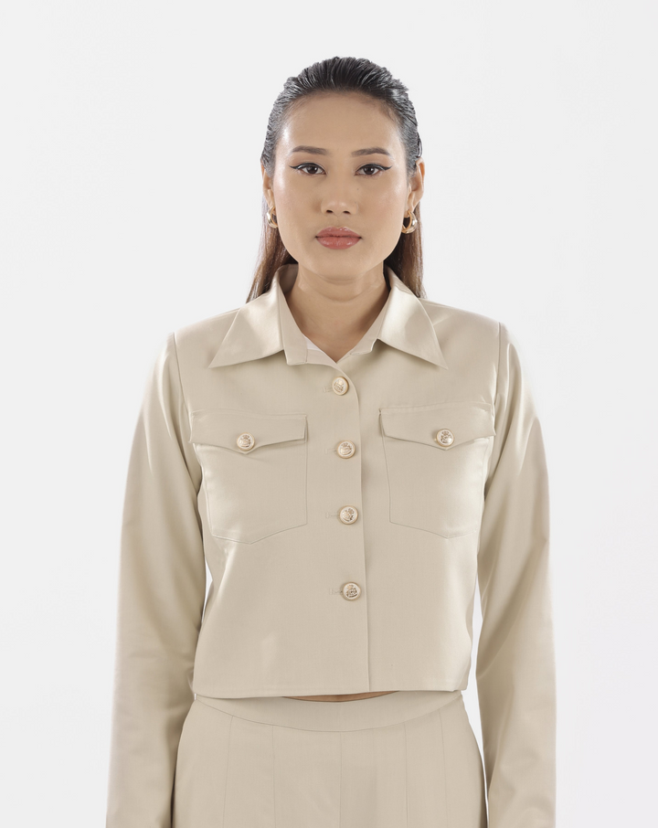 Tailored with quiet luxury in mind, this top is crafted from premium Italian suiting fabric, offering a smooth, structured finish with an impeccable fit. The cropped jacket features sharp collars, flap pockets, and is elevated with luxurious metallic buttons that add a refined touch.