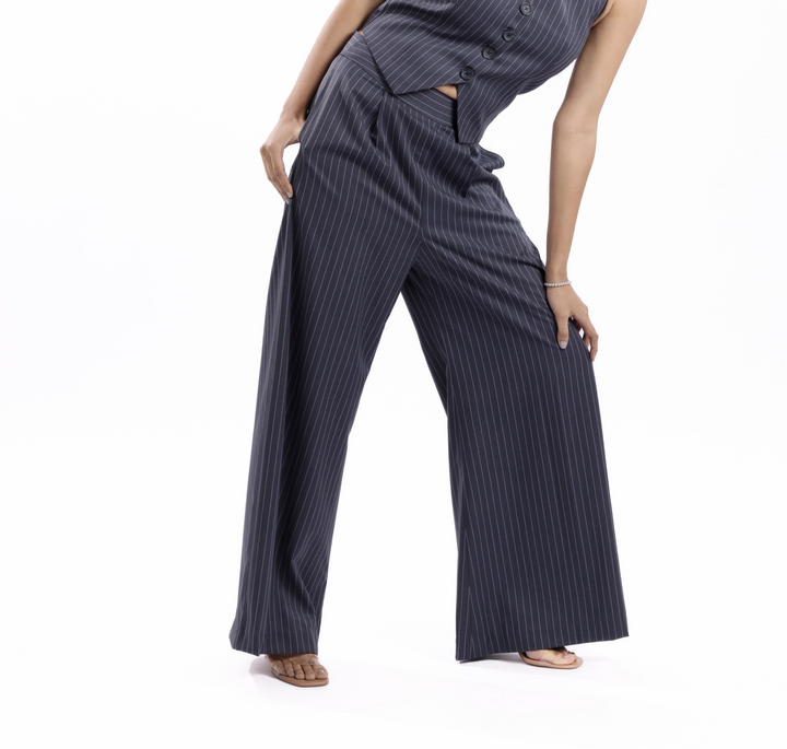 Crafted from premium Super 120-count Scottish stripe fabric, it’s perfect for any season.The high-waisted trousers feature expertly tailored wide legs for a relaxed yet polished look. Front pleats add comfort and elegance, while the side zip closure brings a touch of modern flair. Practical pockets add functionality, making this trouser versatile enough to wear mix and match with other pieces.