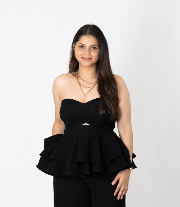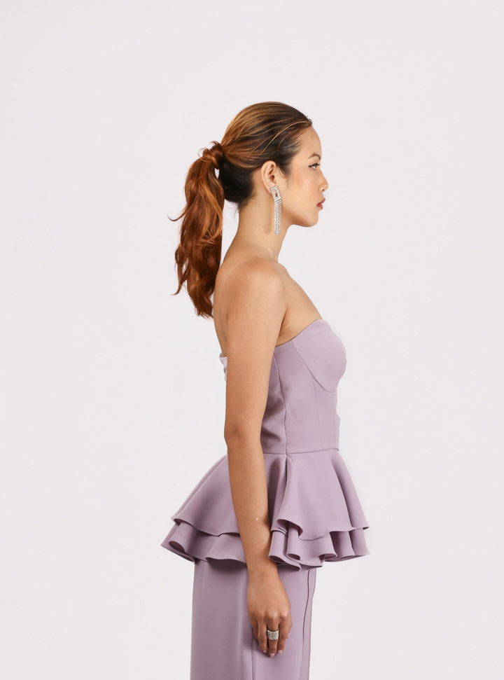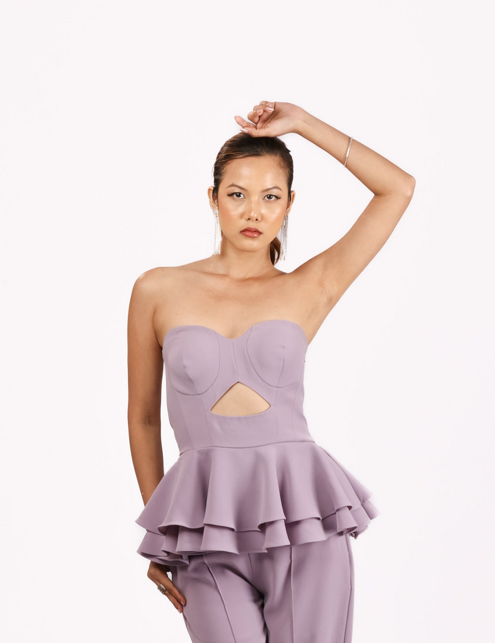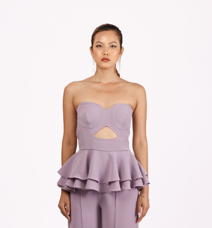 Designed in a fresh lilac Japanese suiting fabric, this top is a perfect fusion of femininity, boldness, and expert craftsmanship. The strapless top features a sophisticated peek-a-boo cutout, adding a touch of allure and confidence. Double-layered ruffles bring movement and volume, while the elastic back ensures a secure, flattering fit.