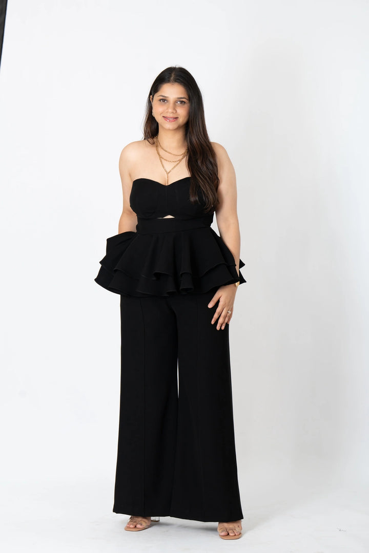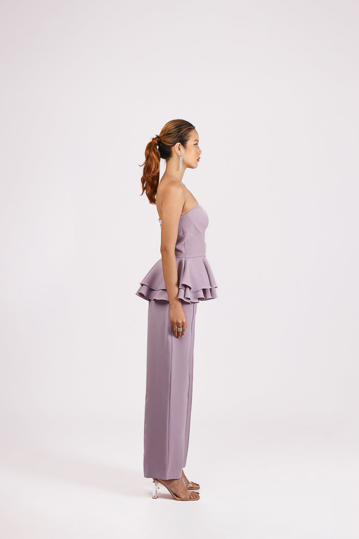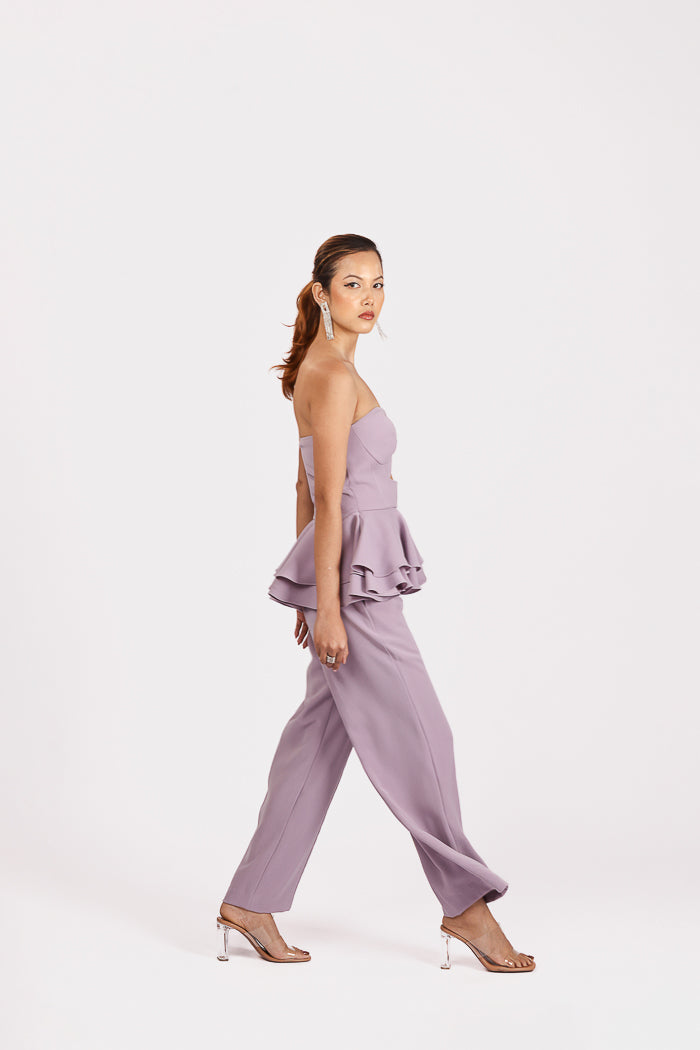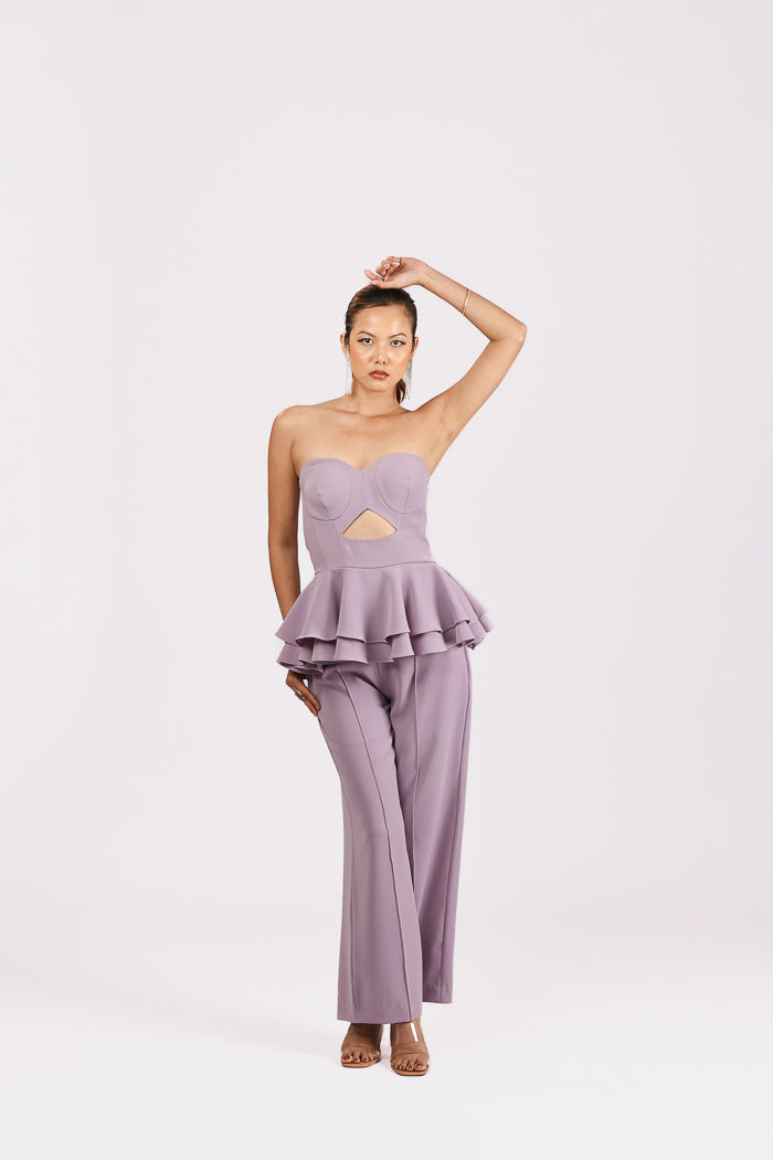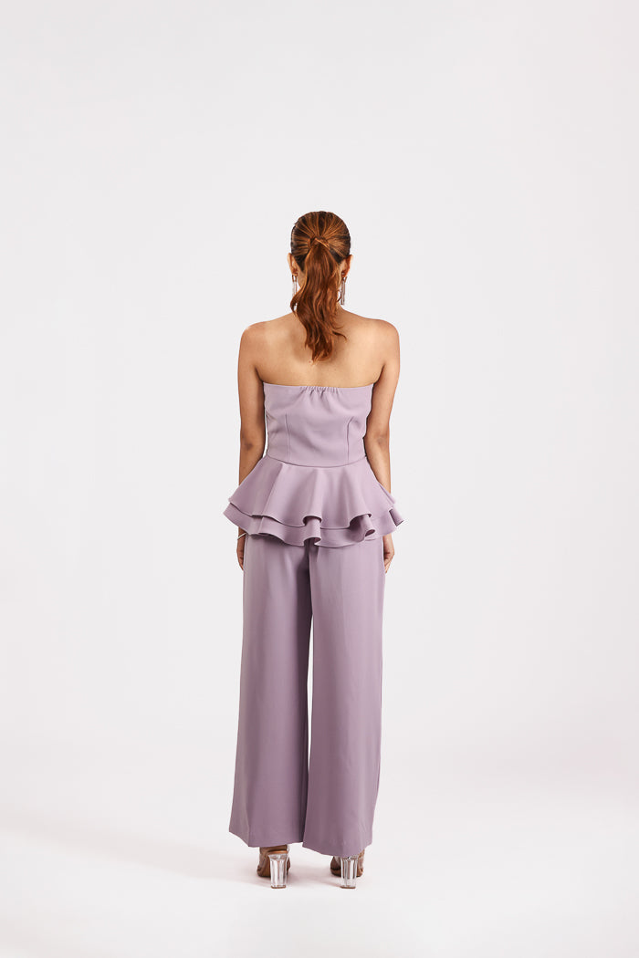 Designed in a fresh lilac Japanese suiting fabric, this coord set is a perfect fusion of femininity, boldness, and expert craftsmanship. The strapless top features a sophisticated peek-a-boo cutout, adding a touch of allure and confidence. Double-layered ruffles bring movement and volume, while the elastic back ensures a secure, flattering fit.