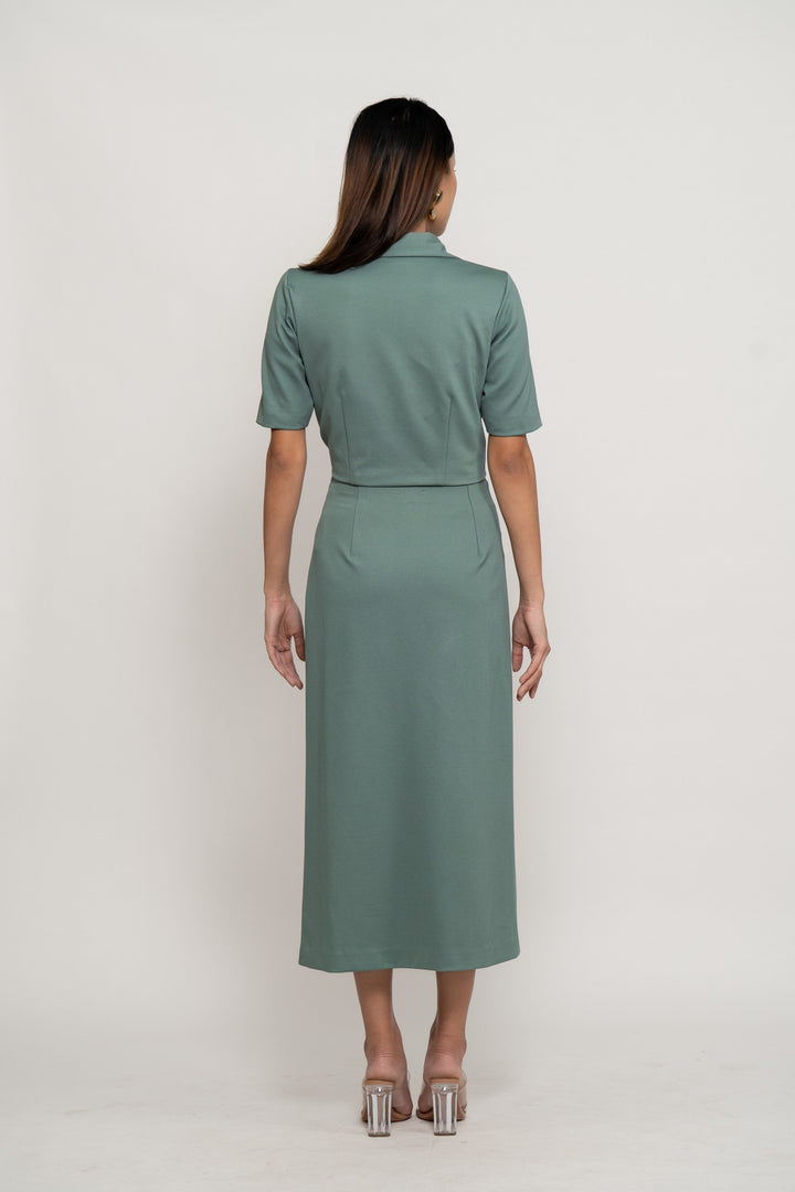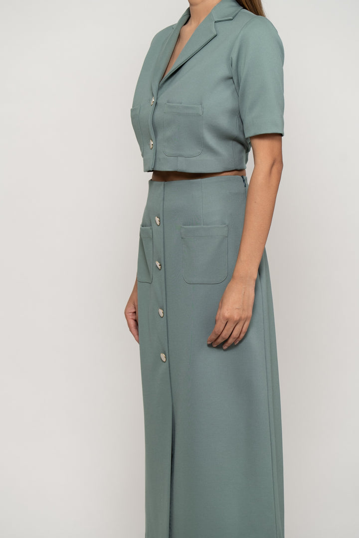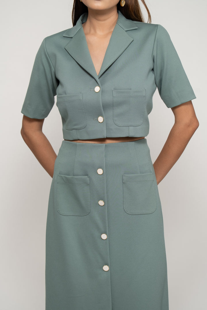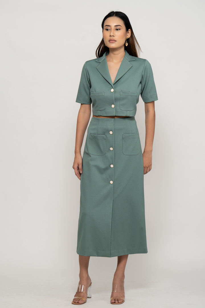 Cut from stretch suiting, this fresh green co-ord set is your summer statement. The short blazer, detailed with metallic buttons and front closure, blends modern polish with ease. The midi skirt features a clean waistband, side zip, and front slit for effortless movement. Finished with functional pockets, it’s power dressing made light.