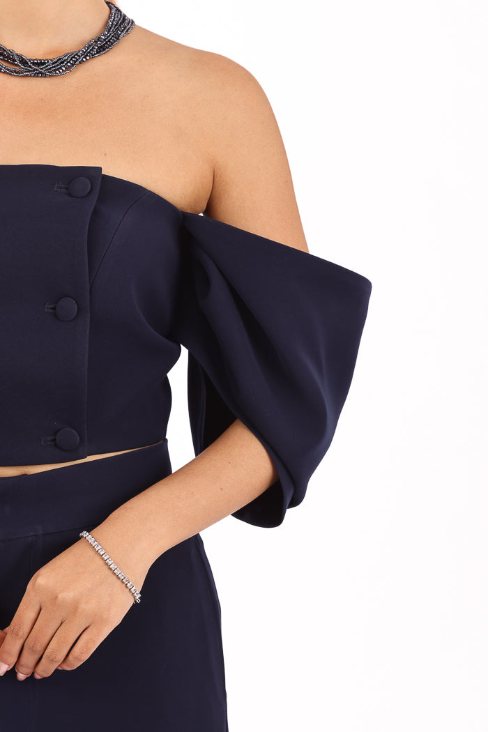 Crafted from crisp Japanese suiting fabric in a fresh navy hue, this top blends luxury with modern power dressing. The top, doubling as a short blazer, exudes sophistication and authority, with handmade drape sleeves for a refined fall and fabric buttons adding a touch of elegance. The princess cut enhances femininity, while the front button closure ensures ease and versatility.