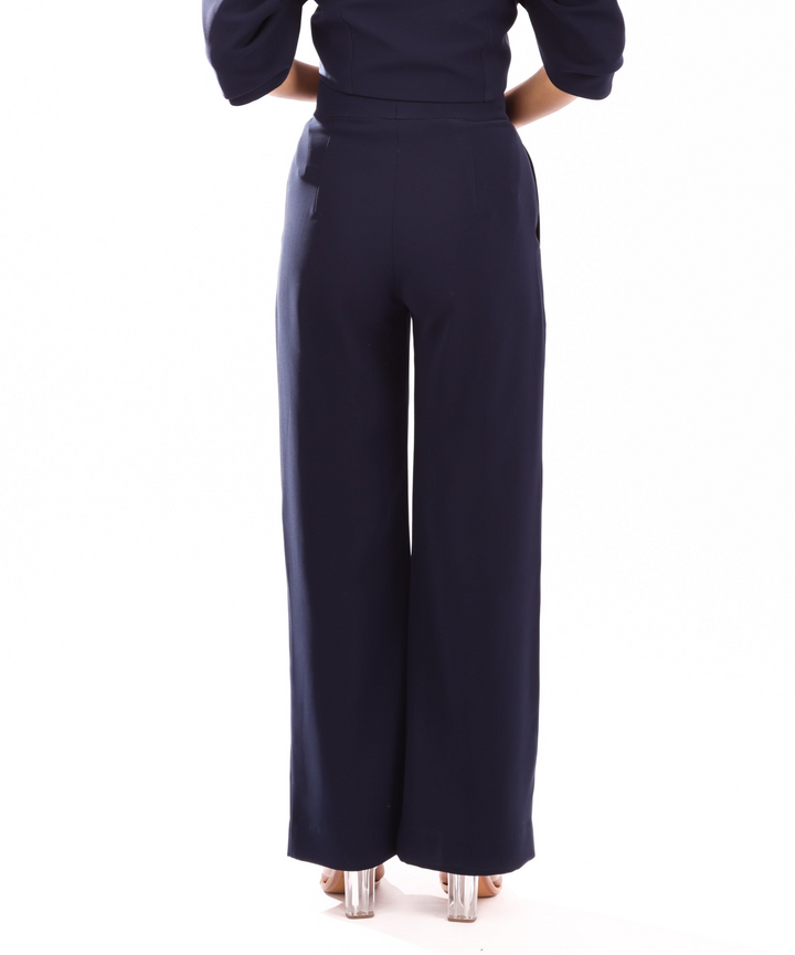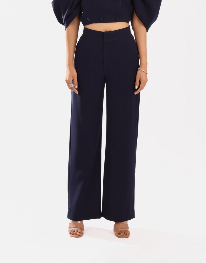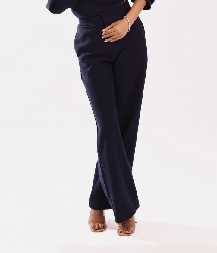 Crafted from crisp Japanese suiting fabric in a fresh navy hue, this trouser blends luxury with modern power dressing.the sleek, tailored trousers offer simplicity and timeless appeal, featuring a wide waistband for a perfect fit and functional pockets. Ideal for conferences, award nights, or a classy date night, this set is a must-have for modern elegance and effortless confidence.