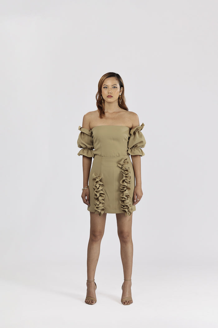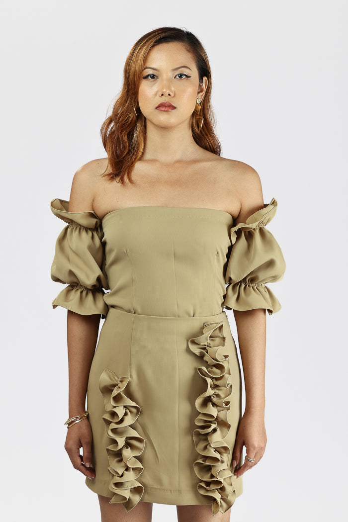 Fresh, feminine, and full of flair—this mustard yellow co-ord set brings structured romance to the forefront. The off-shoulder top features voluminous puff sleeves that are fully detachable, allowing you to switch effortlessly between bold and minimalist styling. The clean neckline balances the dramatic sleeve, creating a silhouette that’s both soft and confident.The matching mini skirt is detailed with cascading ruffles that add movement and texture. Designed with discreet side zip closures on both pieces, this set ensures a seamless fit and easy wear. Ideal for summer soirées, brunches, or evening affairs, it’s a playful yet polished take on modern dressing.
