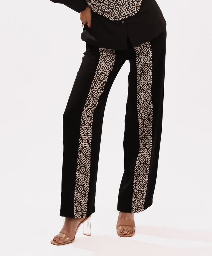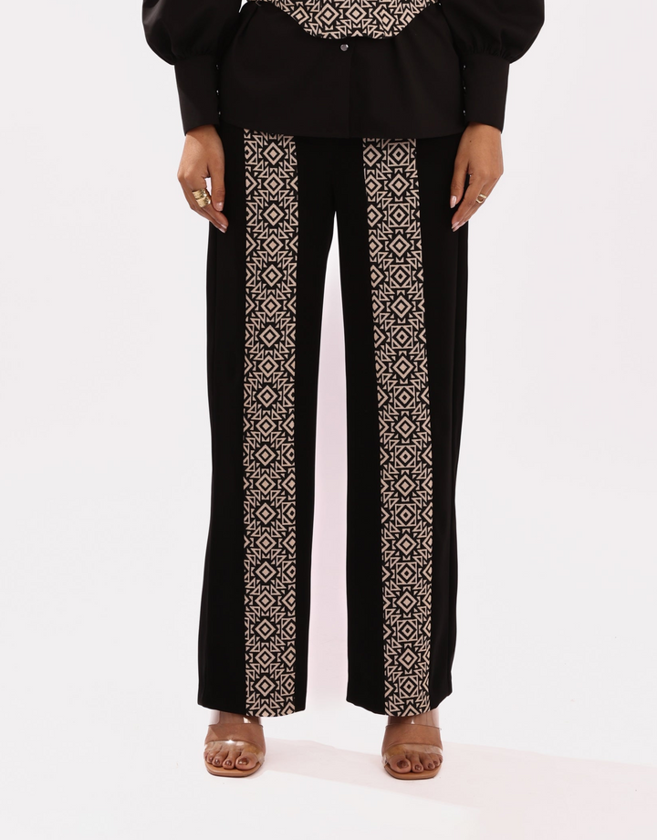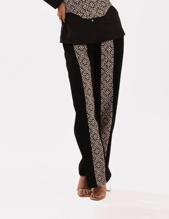 A seamless blend of tradition and edge,these tailored trousers, crafted from luxurious Japanese tuxedo fabric, are elevated with matching jacquard panels that echo the corset motif. Complete with side pockets, this ensemble is rich in texture, structure, and narrative—perfect for the confident dresser who merges boldness with tradition.