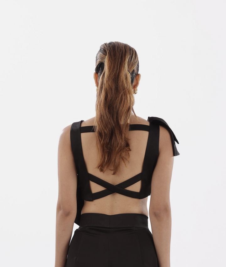 This one-shoulder top, crafted from luxurious shiny Italian suiting fabric, features double ruffle detailing for a dramatic, voluminous effect. A cross cut-out on the back adds a modern edge, while a side zip closure keeps the look clean. A strategic back strap ensures comfort and stability.
