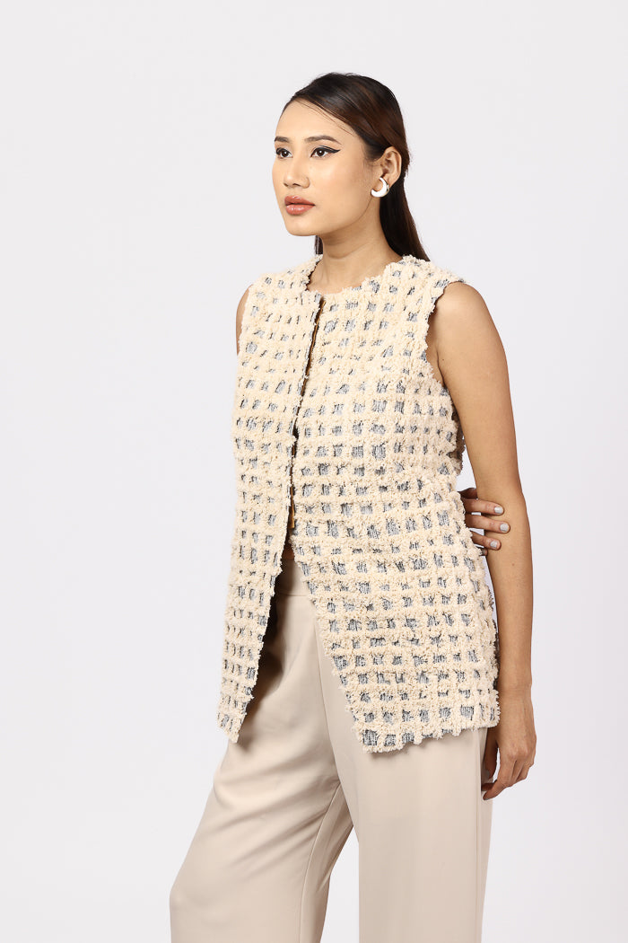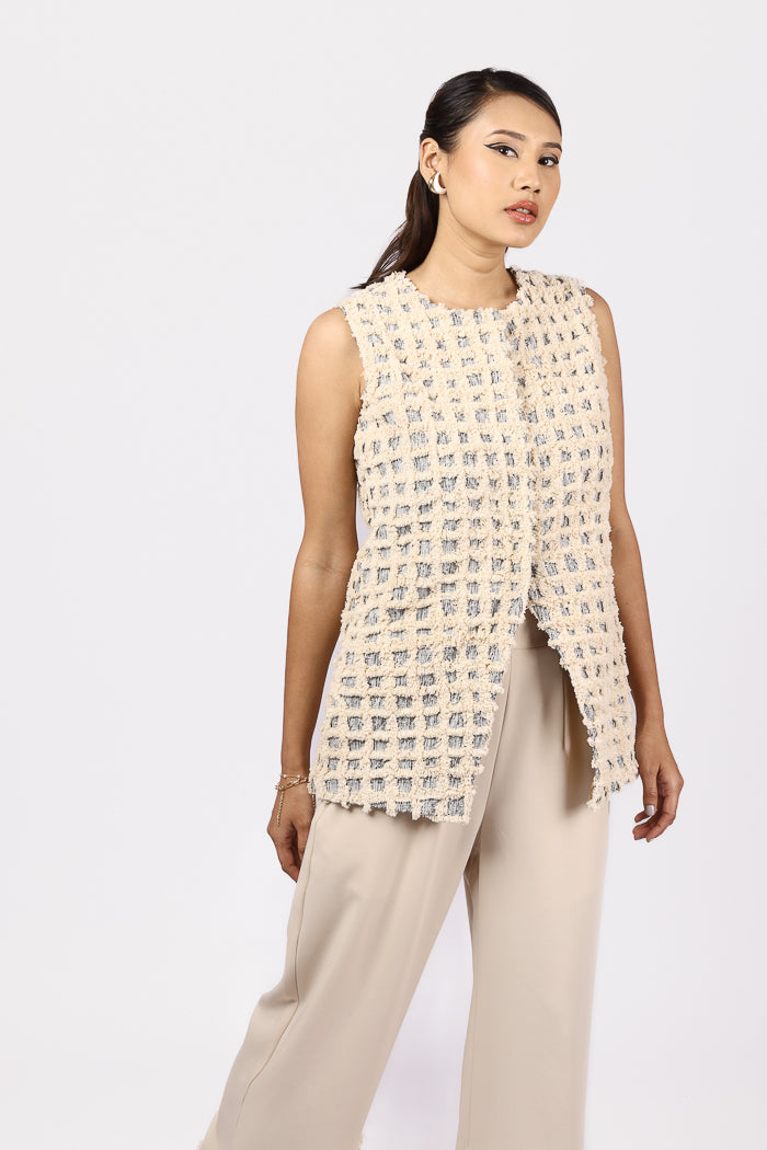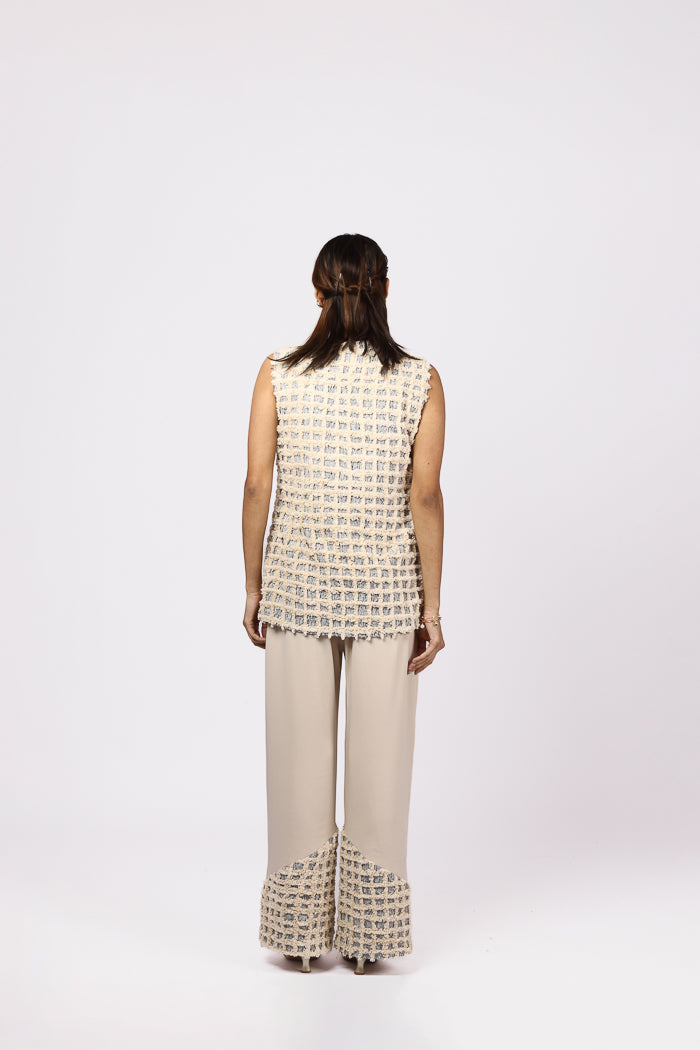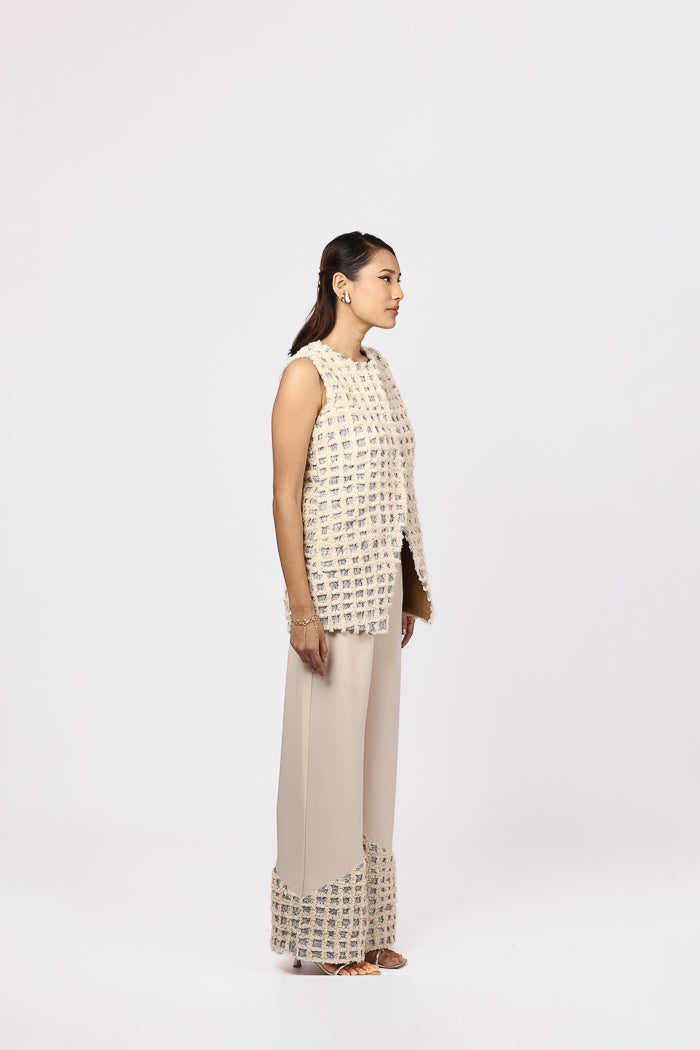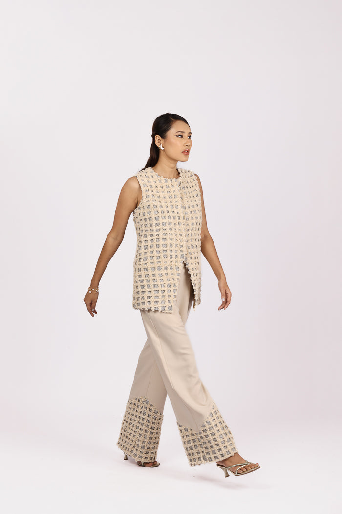 Textured sophistication meets minimal elegance in this two-piece ensemble. The sleeveless jacket is crafted from richly woven jacquard material, featuring a natural thread geometric texture that brings depth and a hand-crafted touch to the silhouette. It’s finished with a concealed front button closure for a clean, seamless look.Paired with flowy wide-leg trousers made from soft Japanese suiting fabric, the pants offer both movement and polish. The hemline is detailed with panels of matching jacquard fabric, creating a cohesive design story. A side zip and functional pockets add comfort and practicality, making this look perfect for elevated daywear or statement layering