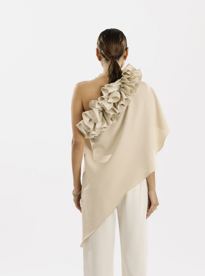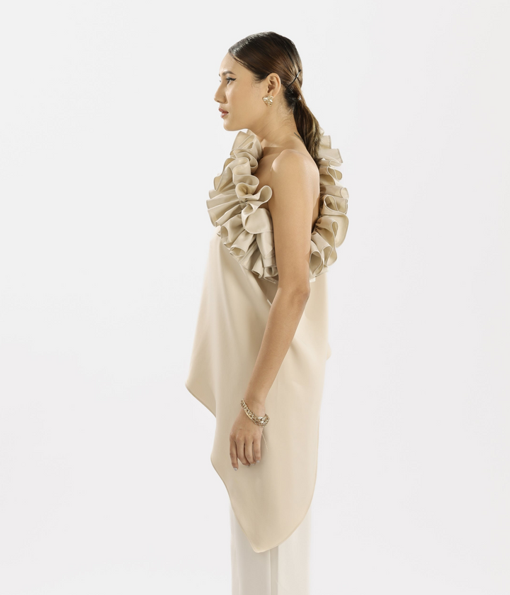 Made from Japanese suiting fabric, this soft, neutral-toned top blends elegance with modern flair. The one-shoulder top features a beautiful ruffle detail that adds drama and texture, while the flowing, asymmetrical cut brings a graceful movement to the look. Inside, a structured tube bustier provides support and shape, making it a thoughtfully designed ensemble.