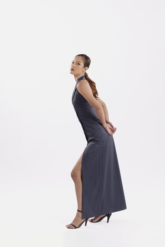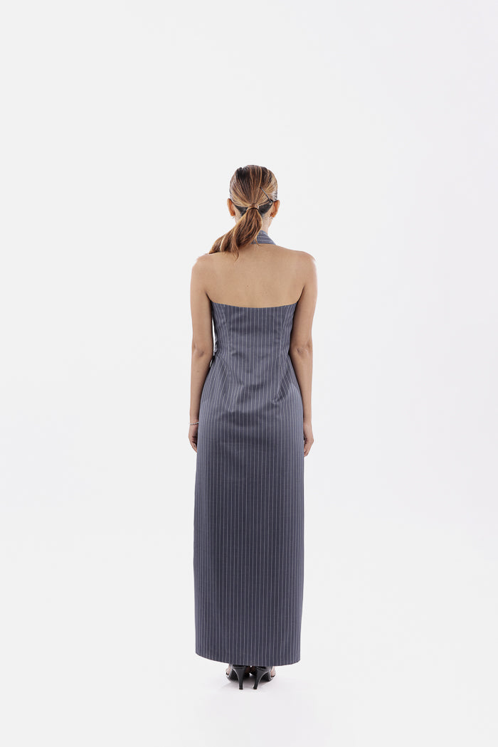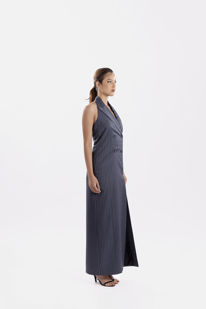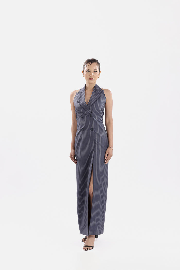 A fusion of power dressing and effortless elegance, this pinstripe dress is crafted from luxurious Italian suiting Super 120’s fabric, offering a refined structure with a fluid drape. The halter neckline adds a modern, sculpted appeal, while the structured lapel collar and double-breasted button closure bring a commanding blazer-inspired aesthetic.
