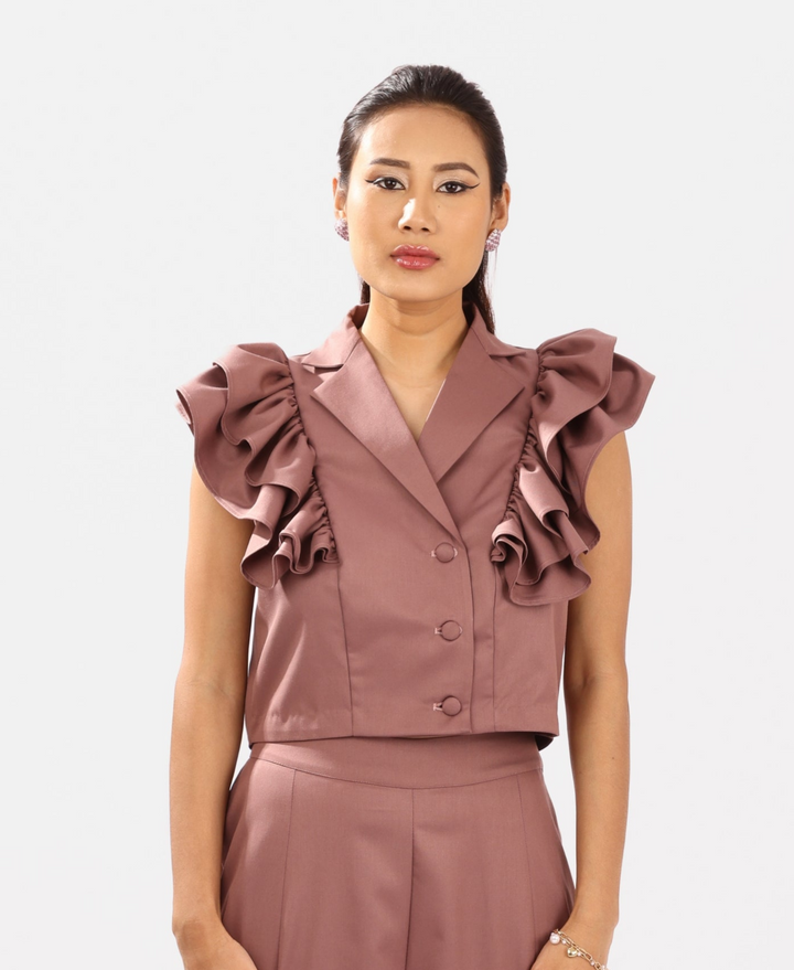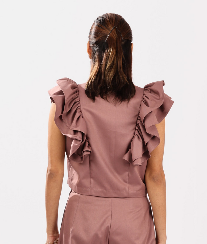 A playful take on classic tailoring, this rust pink top is crafted from breathable cotton suiting fabric, offering a soft structure with a polished finish. The sleeveless top features a double-breasted silhouette with tonal fabric buttons and exaggerated ruffle sleeves that add volume and flair, making it a standout piece.