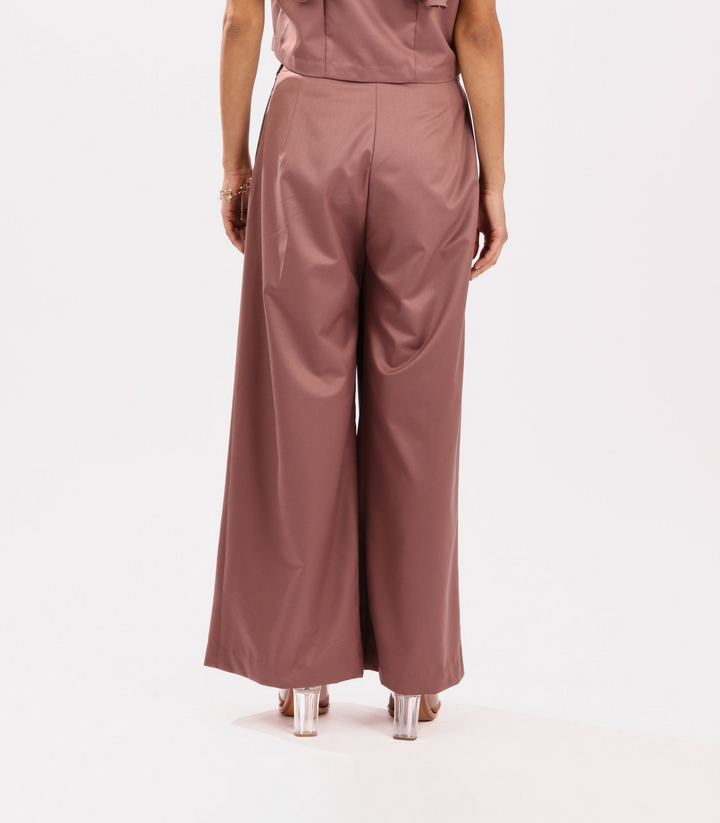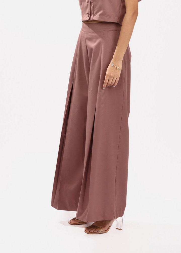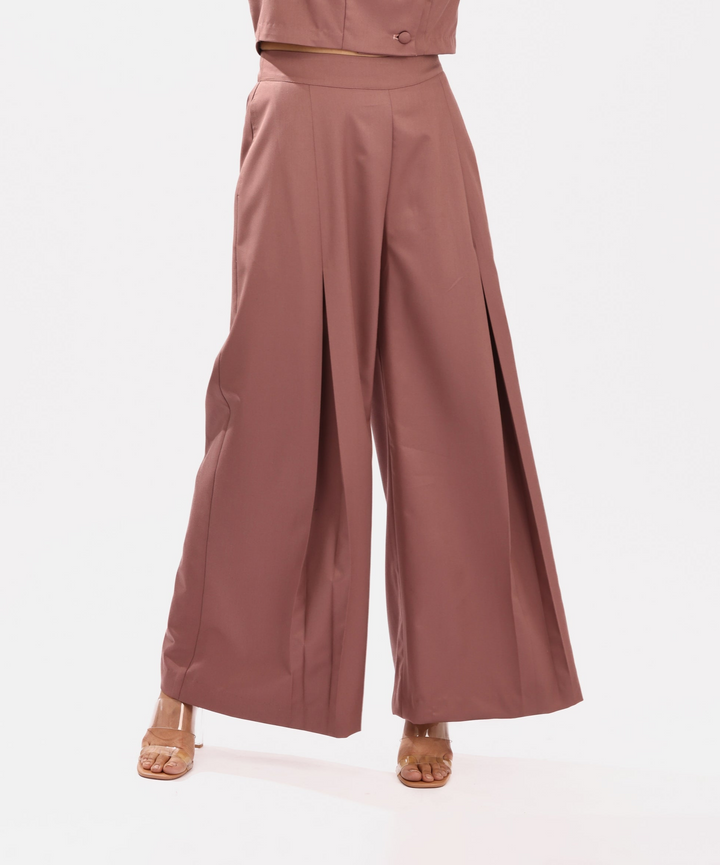 A playful take on classic tailoring, this rust pink trouser is crafted from breathable cotton suiting fabric, offering a soft structure with a polished finish. .The wide-leg trousers are designed with crisp inverted pleats for definition and movement, along with functional side pockets for everyday ease. Elegant yet bold, this look transitions effortlessly from daytime sophistication to evening charm.