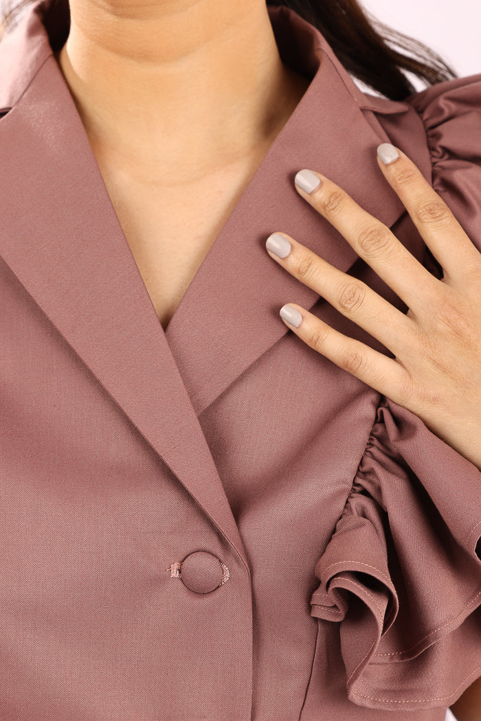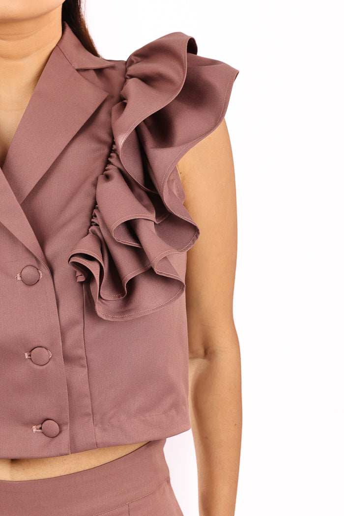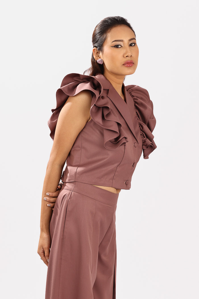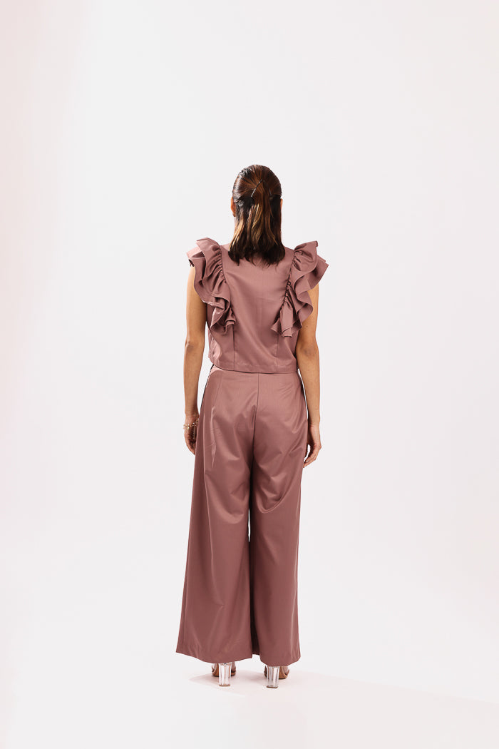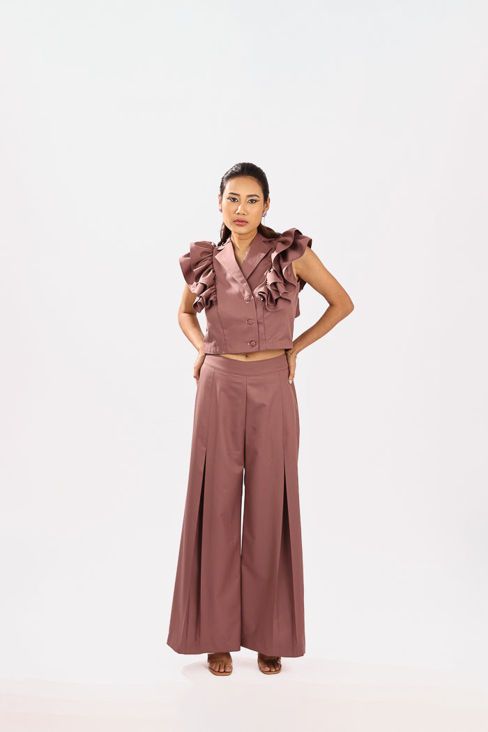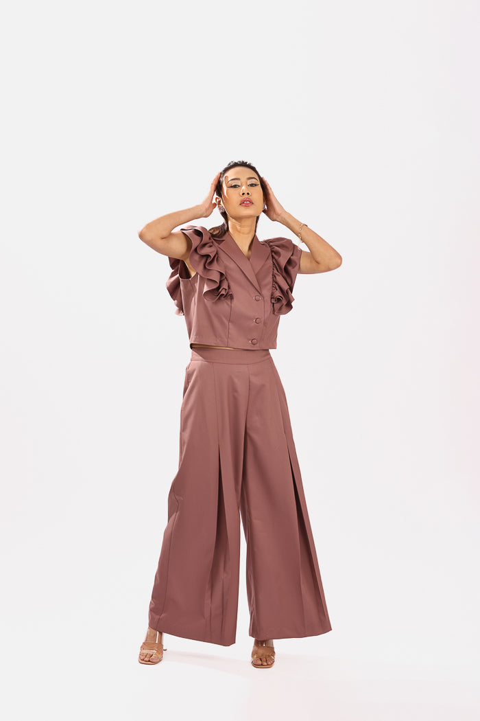 A playful take on classic tailoring, this rust pink co-ord set is crafted from breathable cotton suiting fabric, offering a soft structure with a polished finish. The sleeveless top features a double-breasted silhouette with tonal fabric buttons and exaggerated ruffle sleeves that add volume and flair, making it a standout piece.The matching wide-leg trousers are designed with crisp inverted pleats for definition and movement, along with functional side pockets for everyday ease. Elegant yet bold, this look transitions effortlessly from daytime sophistication to evening charm.