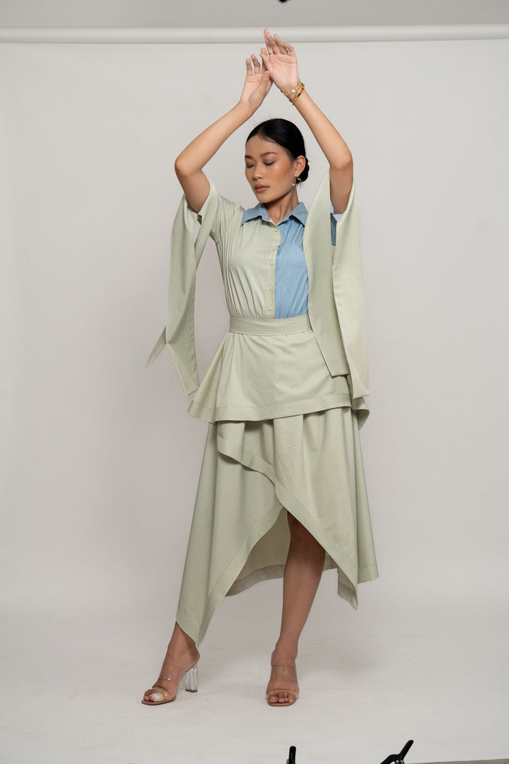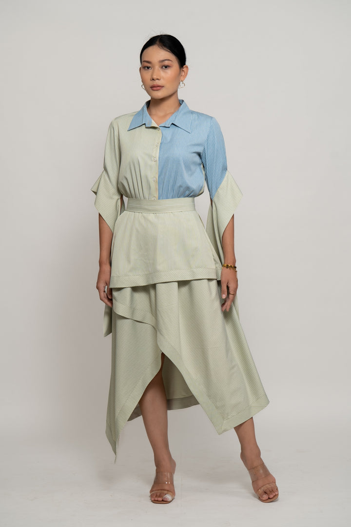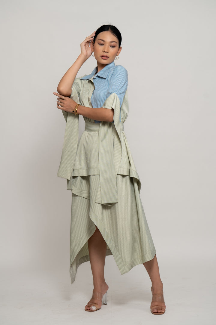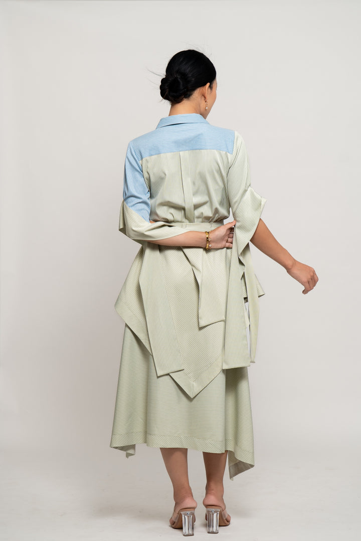 Made in breathable Giza cotton, this two-colored A-line dress is all about power and structure. Featuring a sharp collar, side zip, and belt to define the waist, it commands attention with ease. The layered design adds bounce and movement, while the hanging sleeves bring a touch of playful charm. A bold statement piece for any occasion.