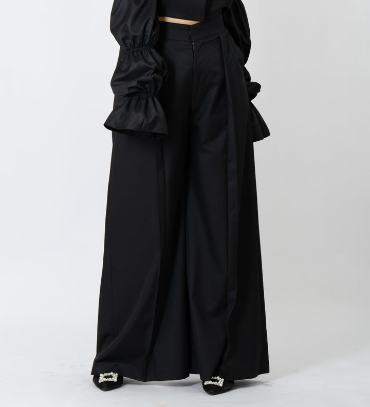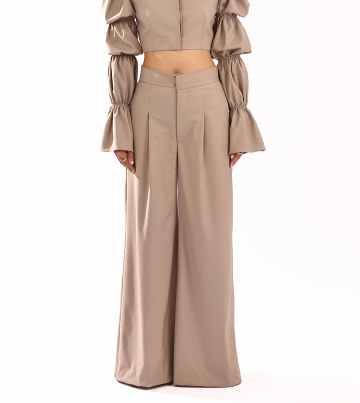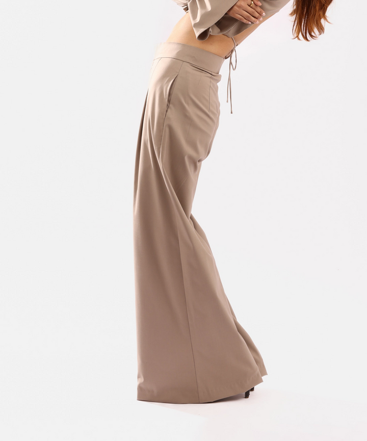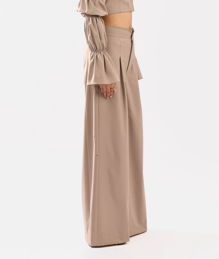 Crafted in a fine Italian suiting material, this unique taupe ensemble embodies futuristic design, structure, and movement, enhanced by bespoke tailoring. The wide-leg trousers feature a single pleat, ensuring both comfort and structure. A high-waist design provides a flattering fit, elongating the frame. Functional pockets add practicality, making this piece as versatile as it is stylish.