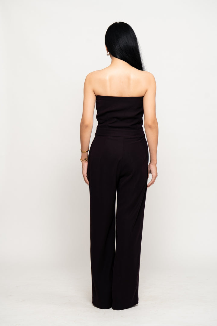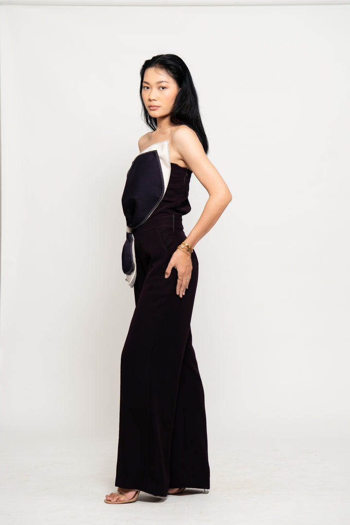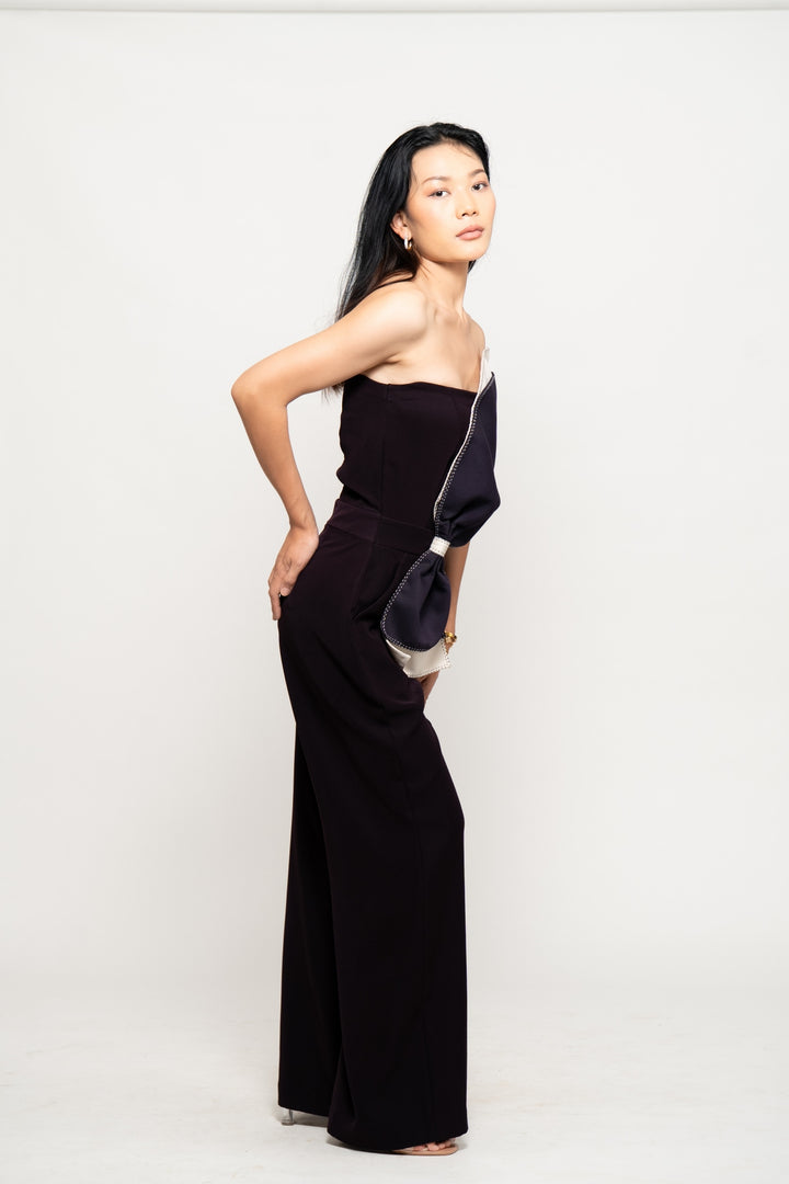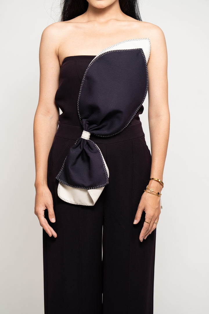 Crafted in luxury crepe suiting, this rich violet jumpsuit commands attention with its tube neckline and sharp silhouette. A dramatic, hand-embroidered leaf-shaped bow adorns the front, adding couture flair. Designed with a side zip and pockets, it balances function with bold elegance—perfect for conferences and evening events. Make a statement in this standout piece that merges artistry with power dressing.