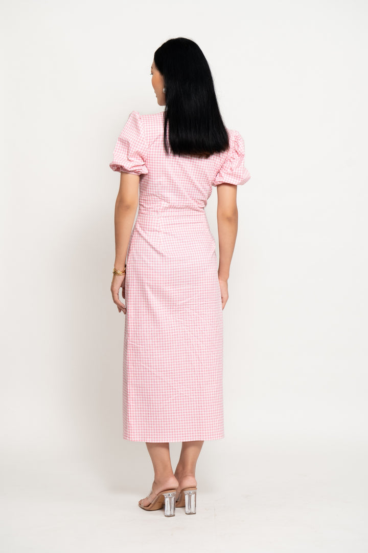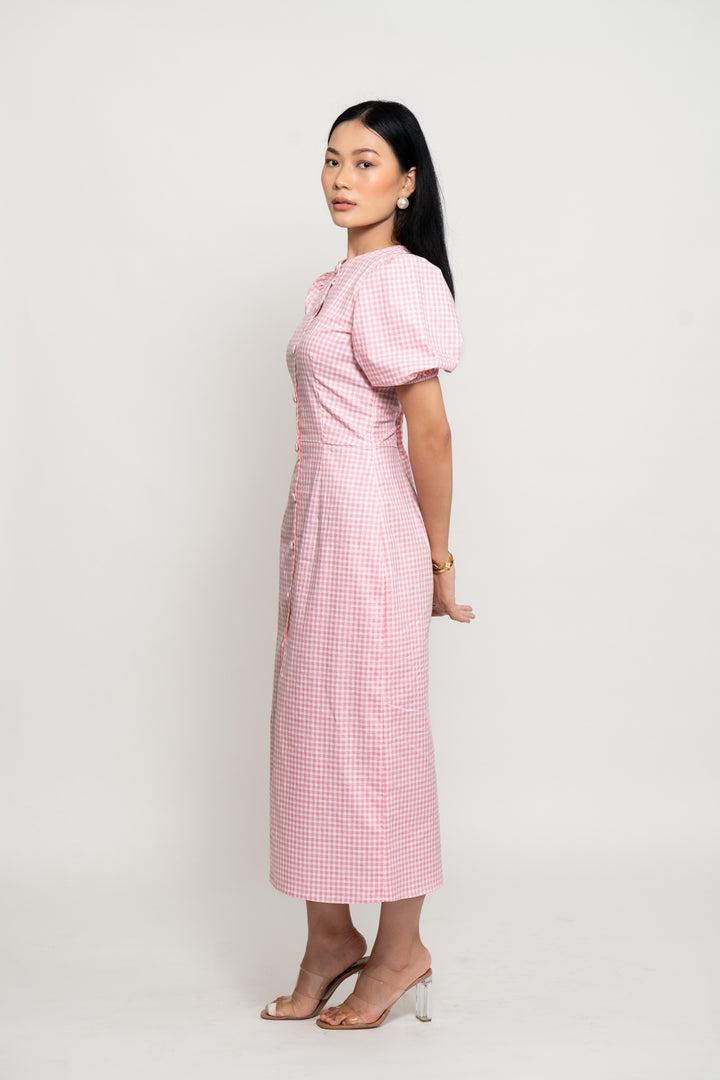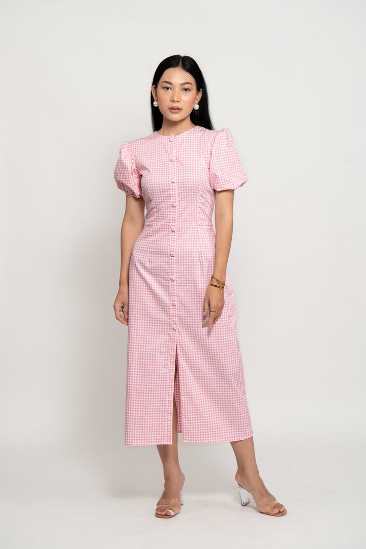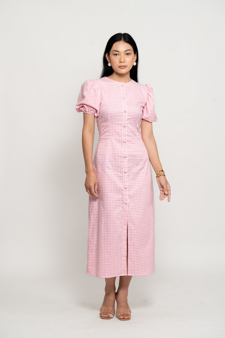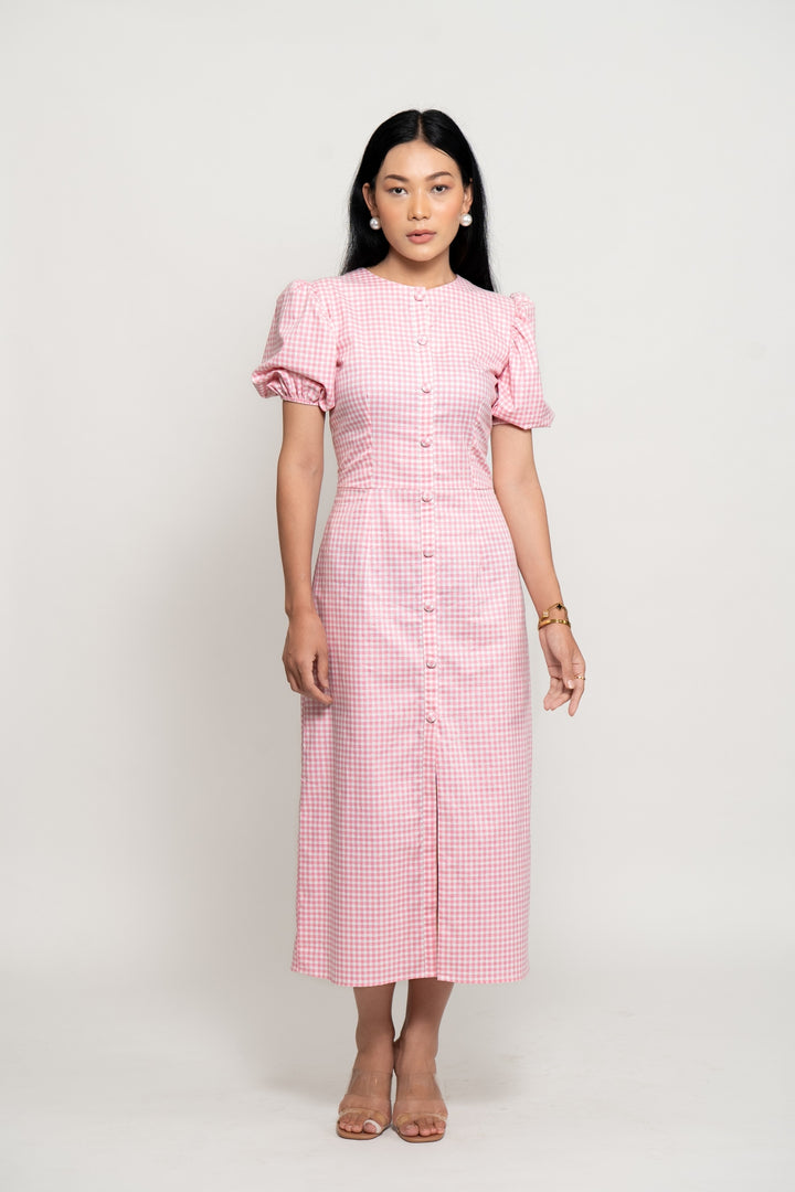 This pink Giza cotton gingham check dress looks like it’s straight off your favorite Pinterest board. Designed for effortless charm, it’s perfect for brunches, lunches, and sunny days out. Featuring puff sleeves, a cinched waist, handmade buttons for a touch of sweetness, and a side zip for ease—this is the dress everyone will want. Fresh, feminine, and irresistibly desirable.