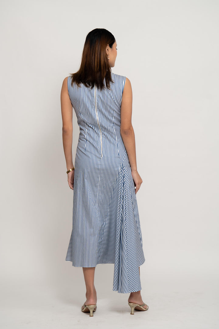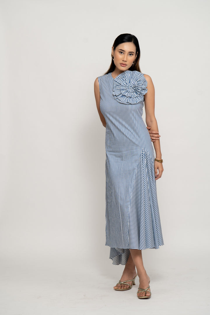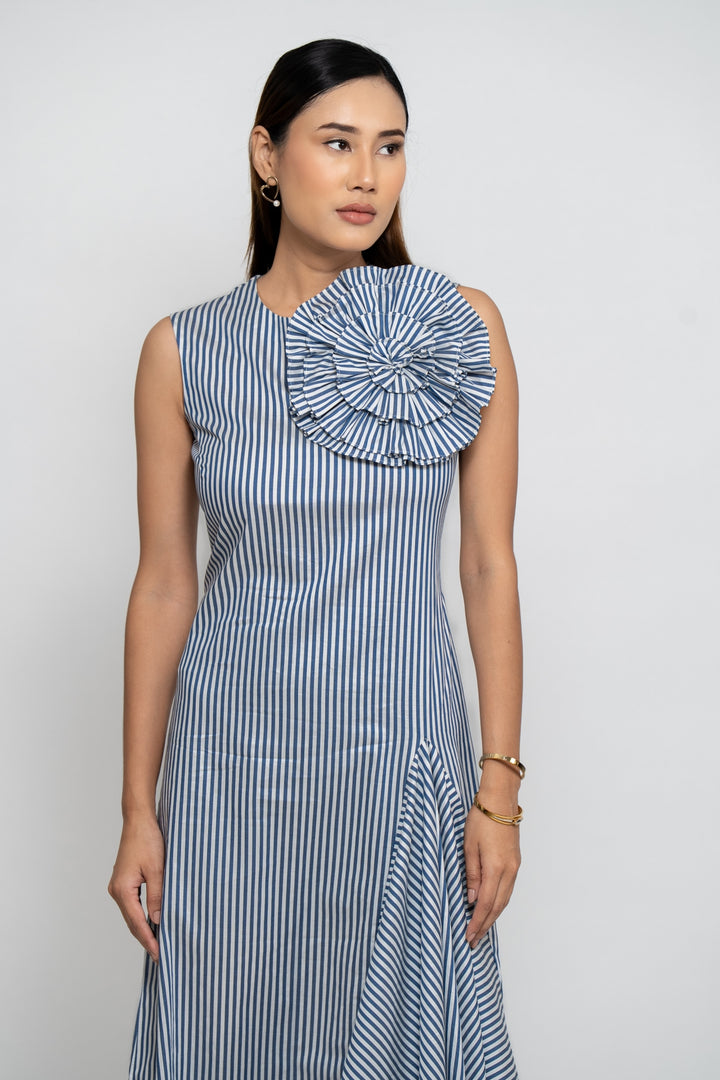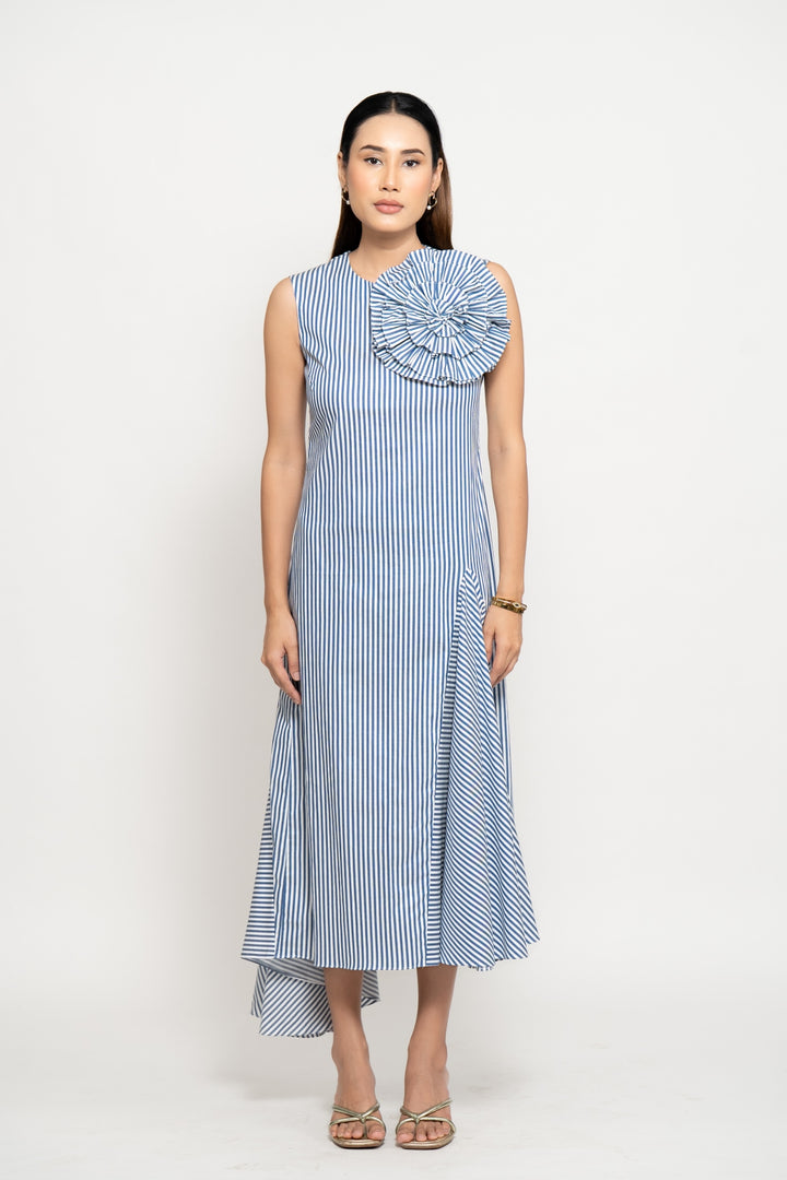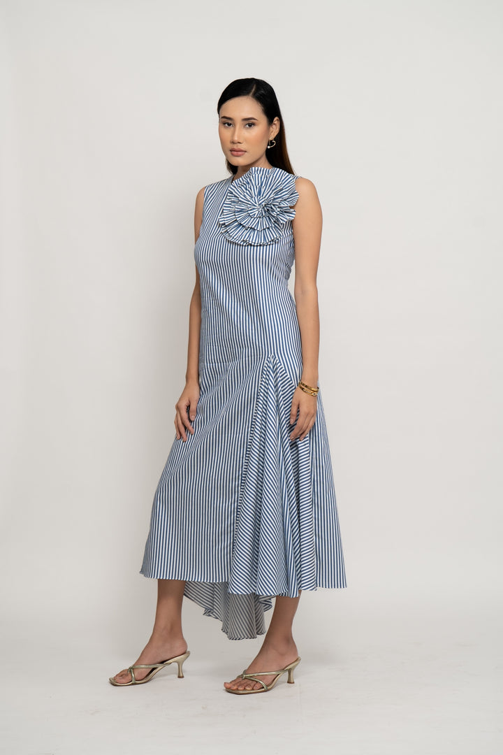Made in soft Giza cotton, this blue-and-white striped dress is your go-to for effortless summer lunches and brunches. A bold ruffle flower on the shoulder brings just the right dose of drama, while the handkerchief-layered hem adds movement and flair. Finished with a sleek back metallic zip, this dress is where fresh charm meets statement style.