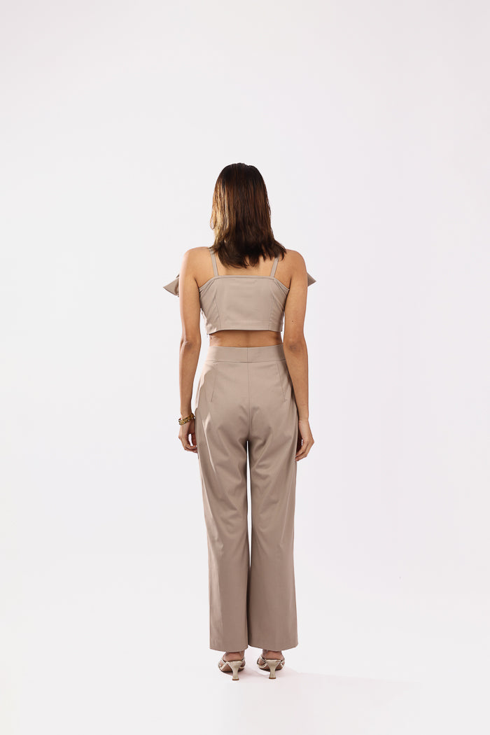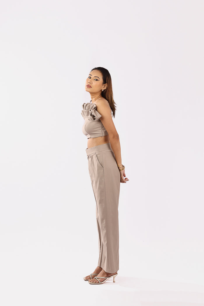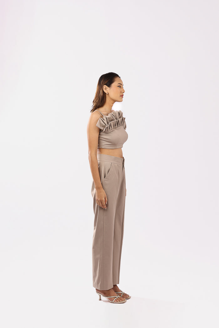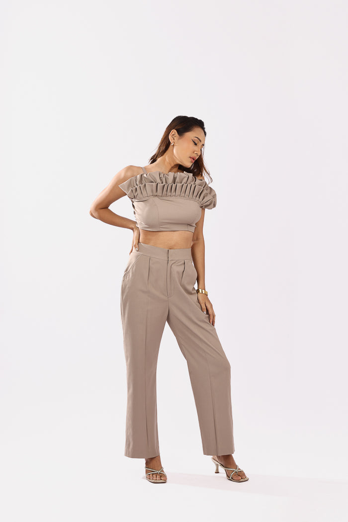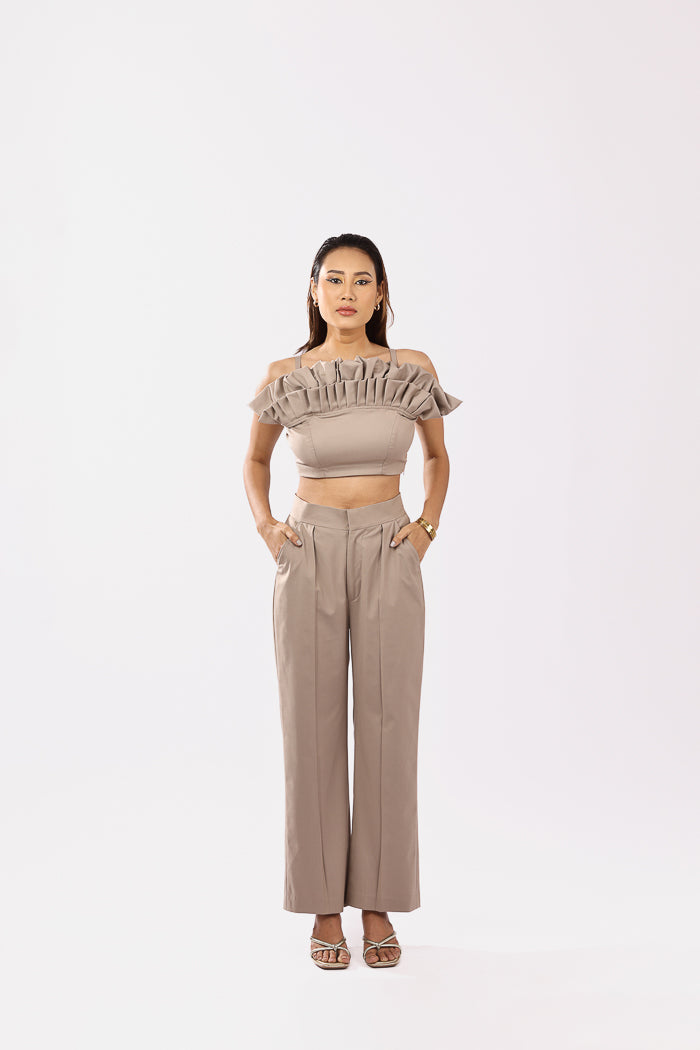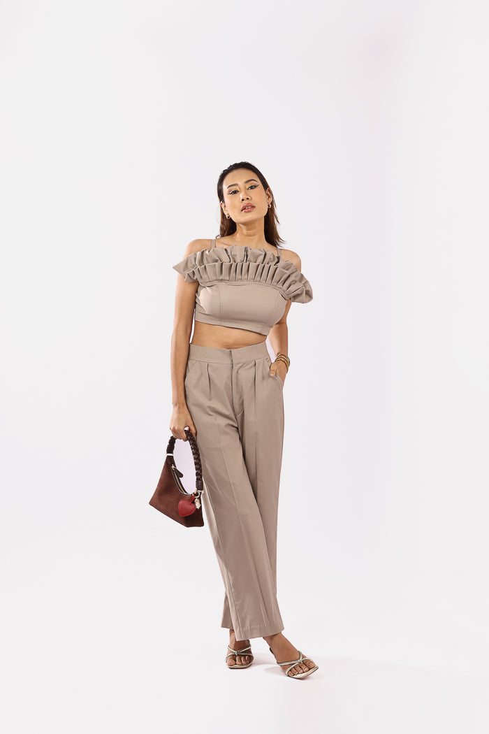 A modern ode to tonal dressing, this ensemble embodies understated glamour with a sculptural twist. The cropped off-shoulder top, adorned with a cascade of structured ruffles, is crafted in a soft neutral tone that complements the high-waisted, wide-leg trousers. The top features a concealed side zip for a seamless fit, while precision pleats at the waistband of the pants add tailored sophistication. Functional side pockets offer ease and practicality, and the exposed midriff introduces an element of playful edge. this look blurs the lines between refined minimalism and bold feminine energy-perfect for rooftop soirées, gallery evenings, or elevated daywear.