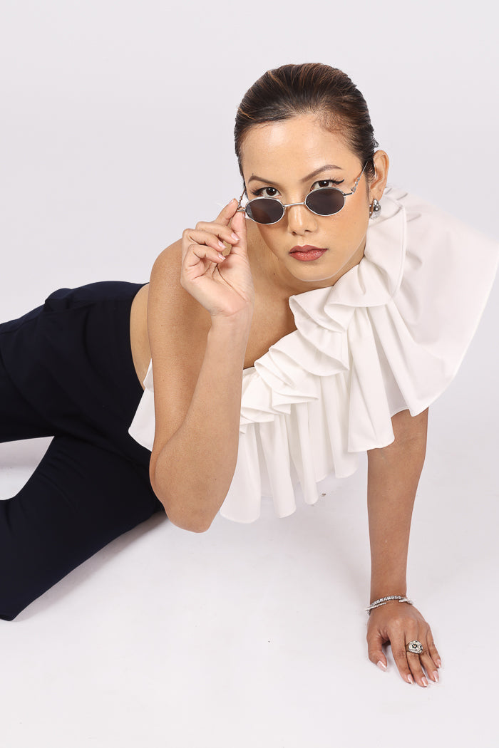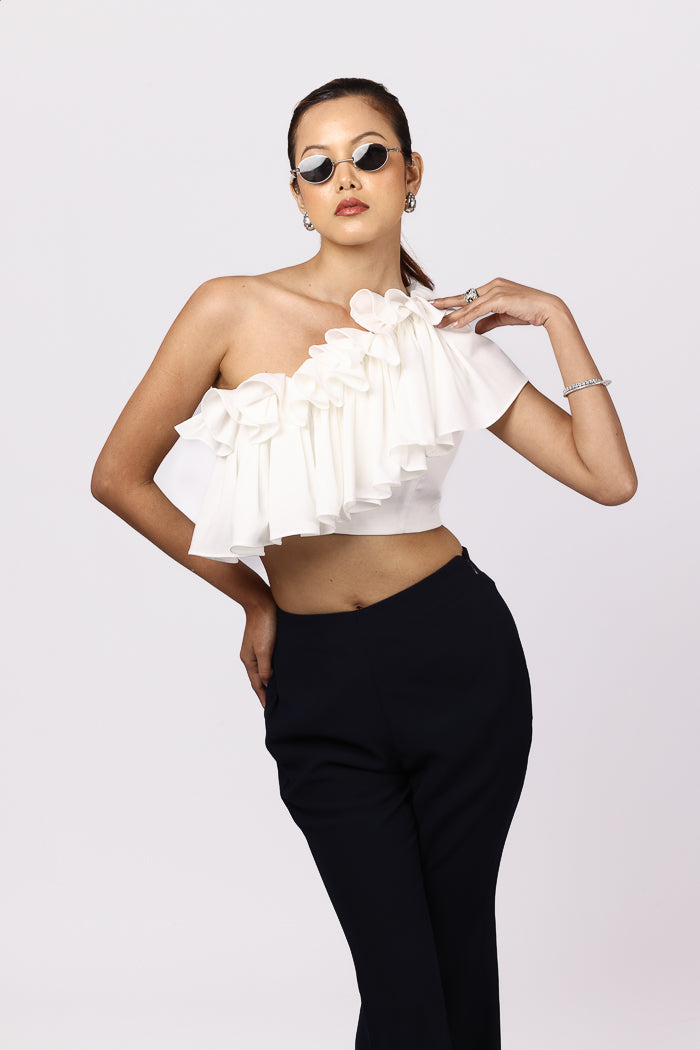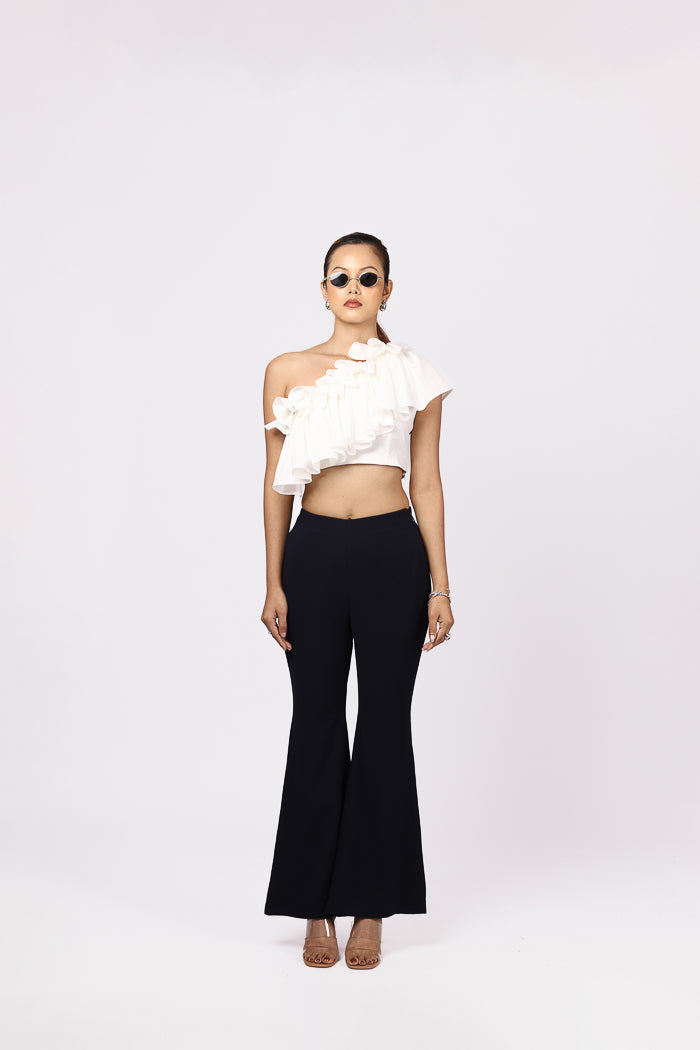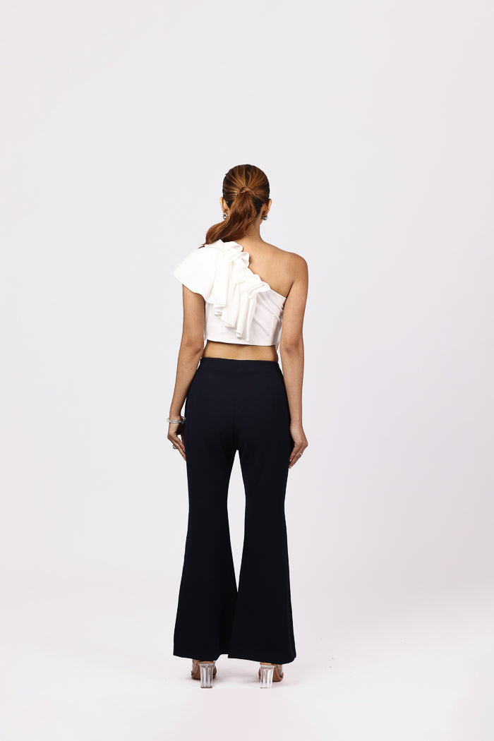 A bold yet refined ensemble that brings structure and flow together seamlessly. The off-shoulder crop top is crafted from a soft, stretchy cotton material that hugs the body while allowing comfortable movement. Its dramatic ruffle detail and asymmetrical neckline add a touch of flair, while a concealed side zip ensures a perfect fit.Paired with high-waisted bell-bottom pants, this look is designed to elongate the legs and create a striking silhouette. The pants feature a sleek side zip and functional side pockets, blending practicality with statement style. Perfect for fashion-forward evenings or standout day looks.