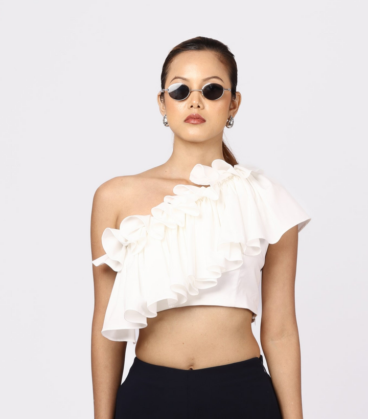 A bold yet refined top that brings structure and flow together seamlessly. The off-shoulder crop top is crafted from a soft, stretchy cotton material that hugs the body while allowing comfortable movement. Its dramatic ruffle detail and asymmetrical neckline add a touch of flair, while a concealed side zip ensures a perfect fit.