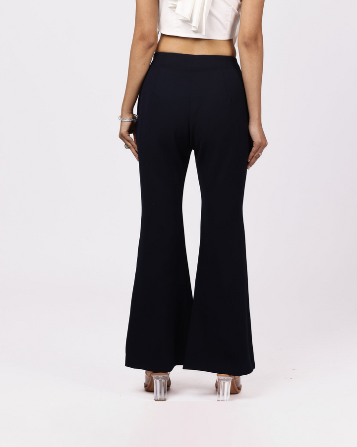 A bold yet refined trouser that brings structure and flow together seamlessly. the high-waisted bell-bottom pants, is designed to elongate the legs and create a striking silhouette. The pants feature a sleek side zip and functional side pockets, blending practicality with statement style. Perfect for fashion-forward evenings or standout day looks.