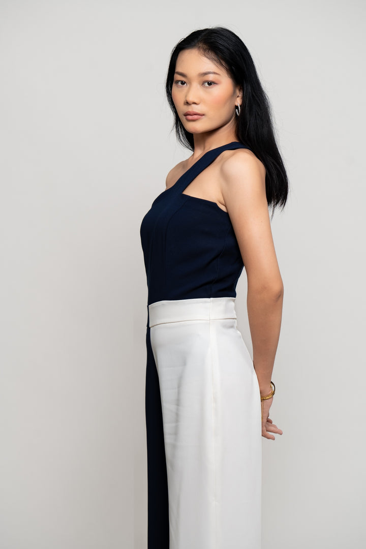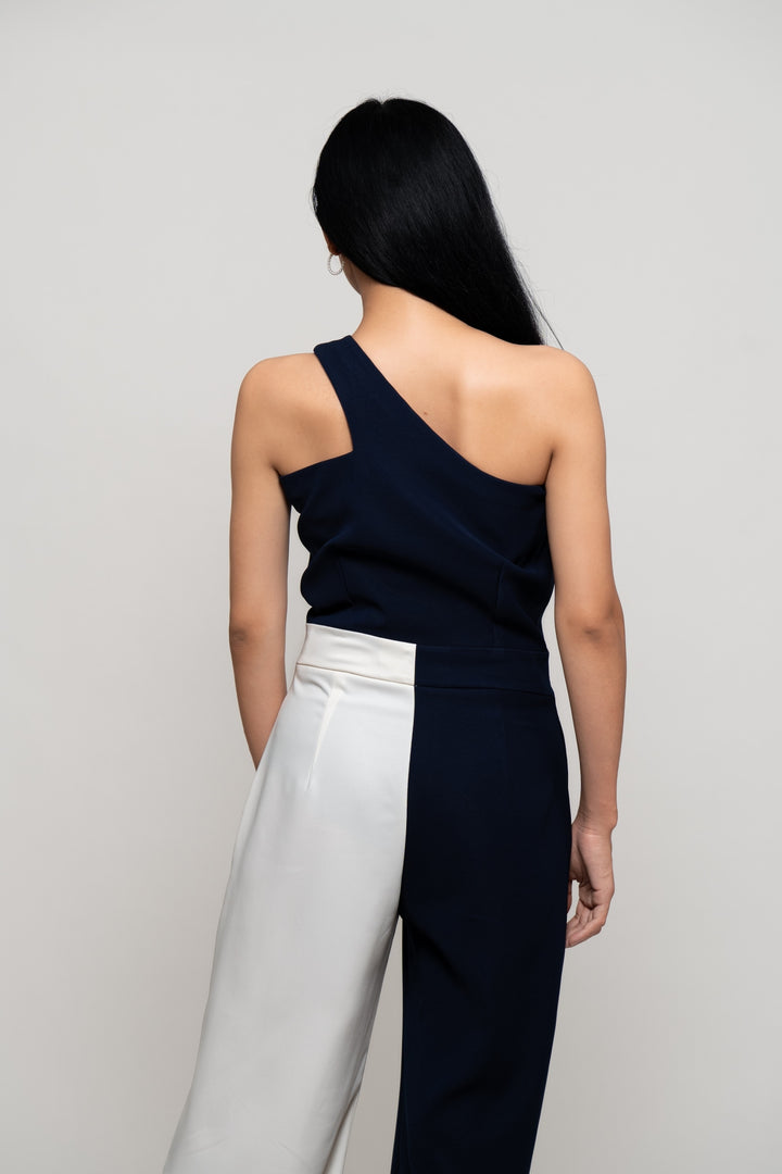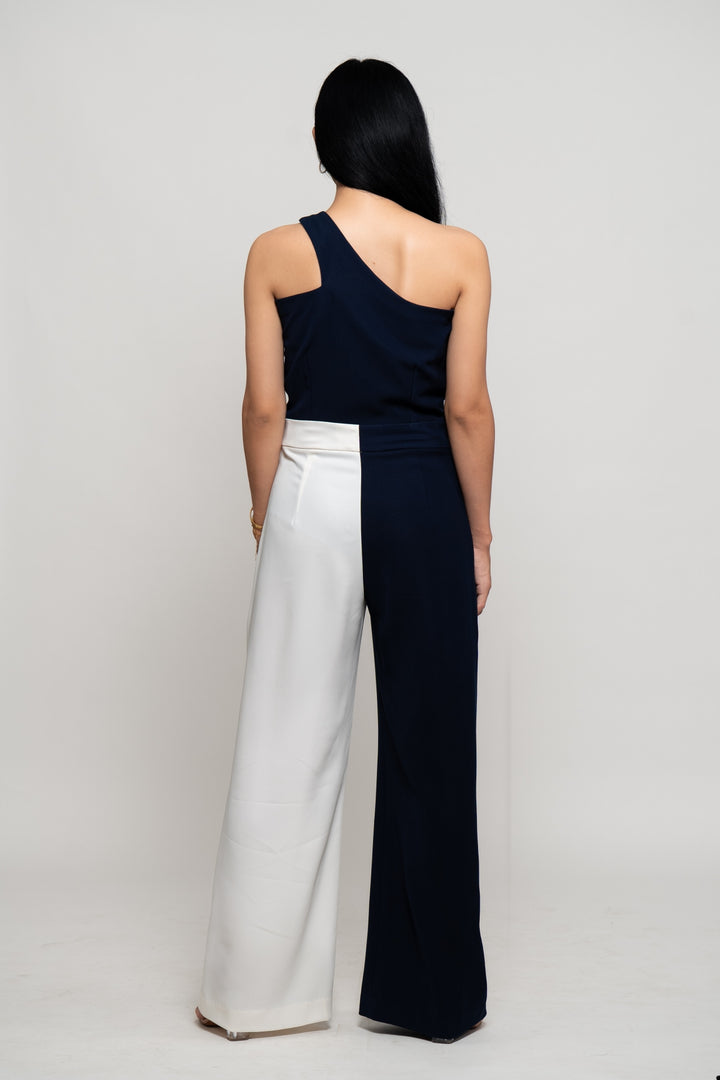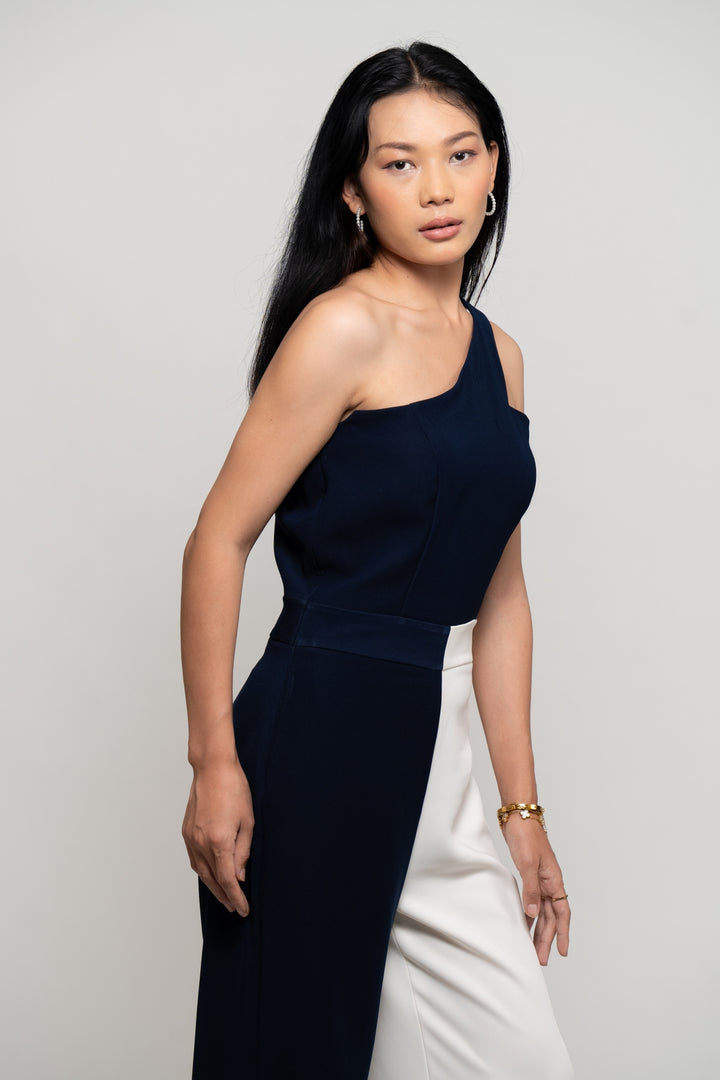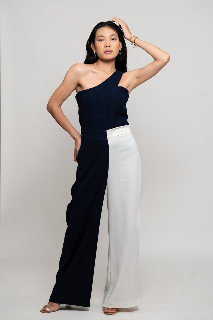 Tailored in luxe crepe, this one-shoulder jumpsuit is a statement in modern power dressing. The sleek silhouette is balanced with thoughtful details—a side zip for a clean finish, functional pocket for ease, and impeccable fit that moves seamlessly from desk to dine. Bold yet refined, it’s your go-to for effortless impact.